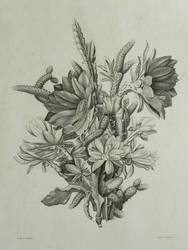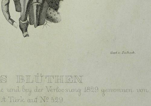 Kovalevski B-C 28. – Aus: Bilderchronik des Sächsischen Kunstvereins (Dresden: Sächsischer Kunstverein 1828-1836). – In der Platte rechts unten signiert: "Gest. v. Zschoch." In der Mitte betitelt und bezeichnet: "Cactus Blüthen, Angekauft vom Sächs. Kunstvereine und bey der Verlosung 1829 gewonnen von Herrn G.A. Türk auf N° 529". – Das gesamte Blatt etwas angeschmutzt und leicht stockfleckig. Kleine Knickspur am unteren Blattrand rechts.