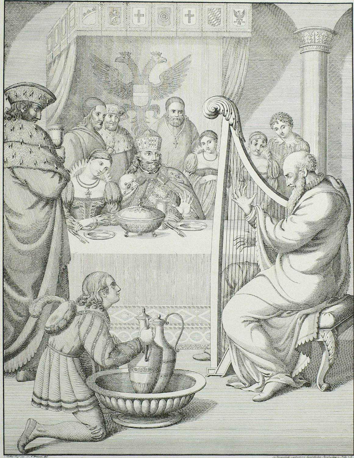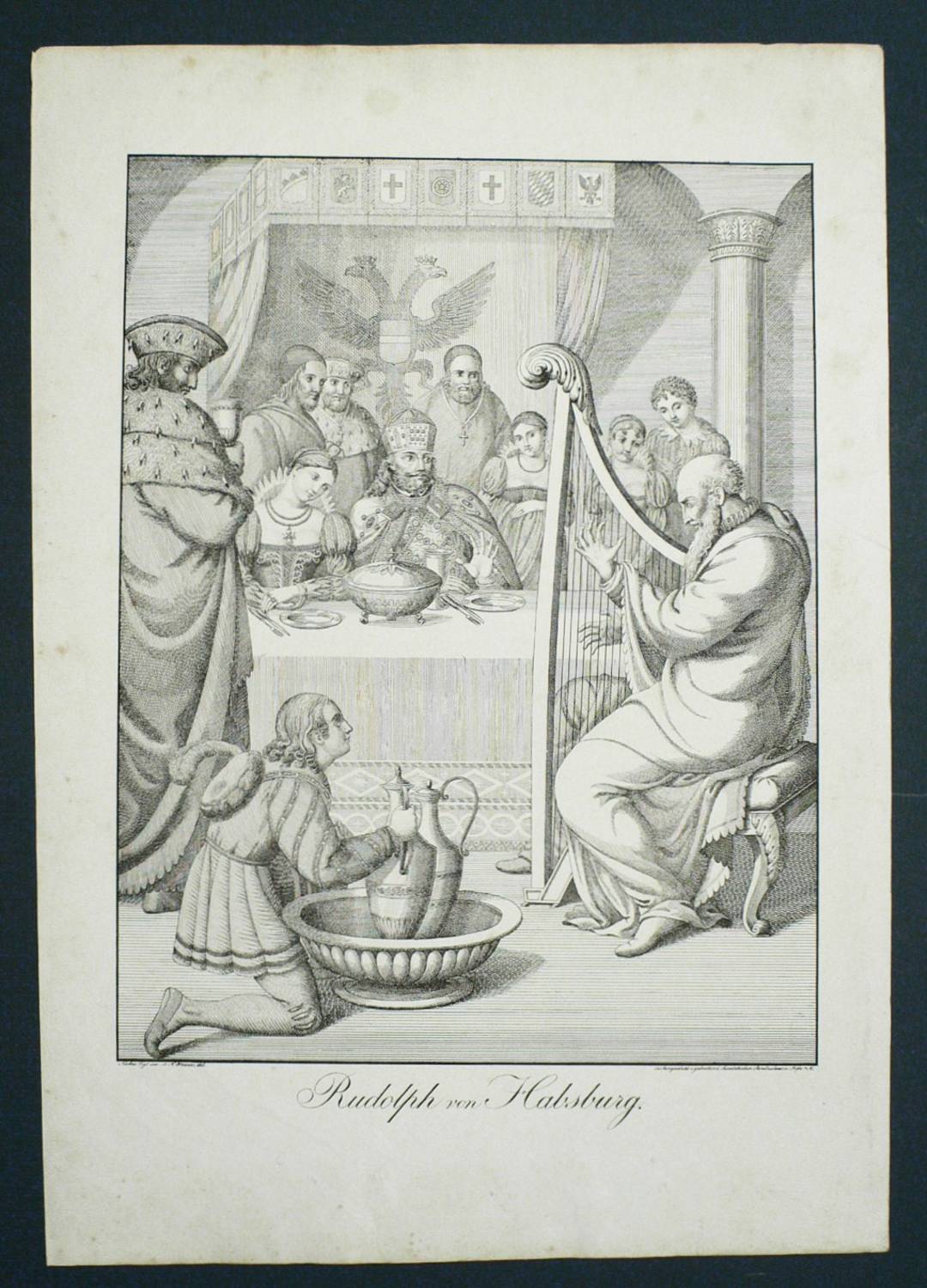 Dussler 2. – Aus: Nicolaus Vogt, Rheinische Bilder. Mit Vier Und Zwanzig Steinzeichnungen (Frankfurt am Main: Hermannsche Buchhandlung 1821). – Im Stein links unten signiert: ″Nicolaus Vogt inv: J. N. Peroux del.″ Unterhalb betitelt. – Lithografische Inkunabel! Gedruckt in der Susenbethschen Steindruckerei in Frankfurt am Main. - In einem Moment des freudigen Erschreckens erkennt der König in dem greisen Sänger den Geistlichen, dem er vor langer Zeit edelmütig sein Streitross schenkte, damit dieser einem Sterbenden das heilige Sakrament bringen konnte. – Im Rand diverse Knickspuren und Flecken, insgesamt guter Zustand.