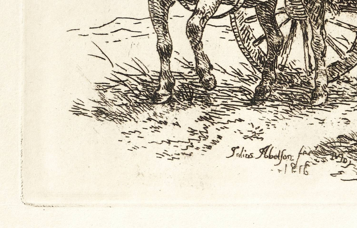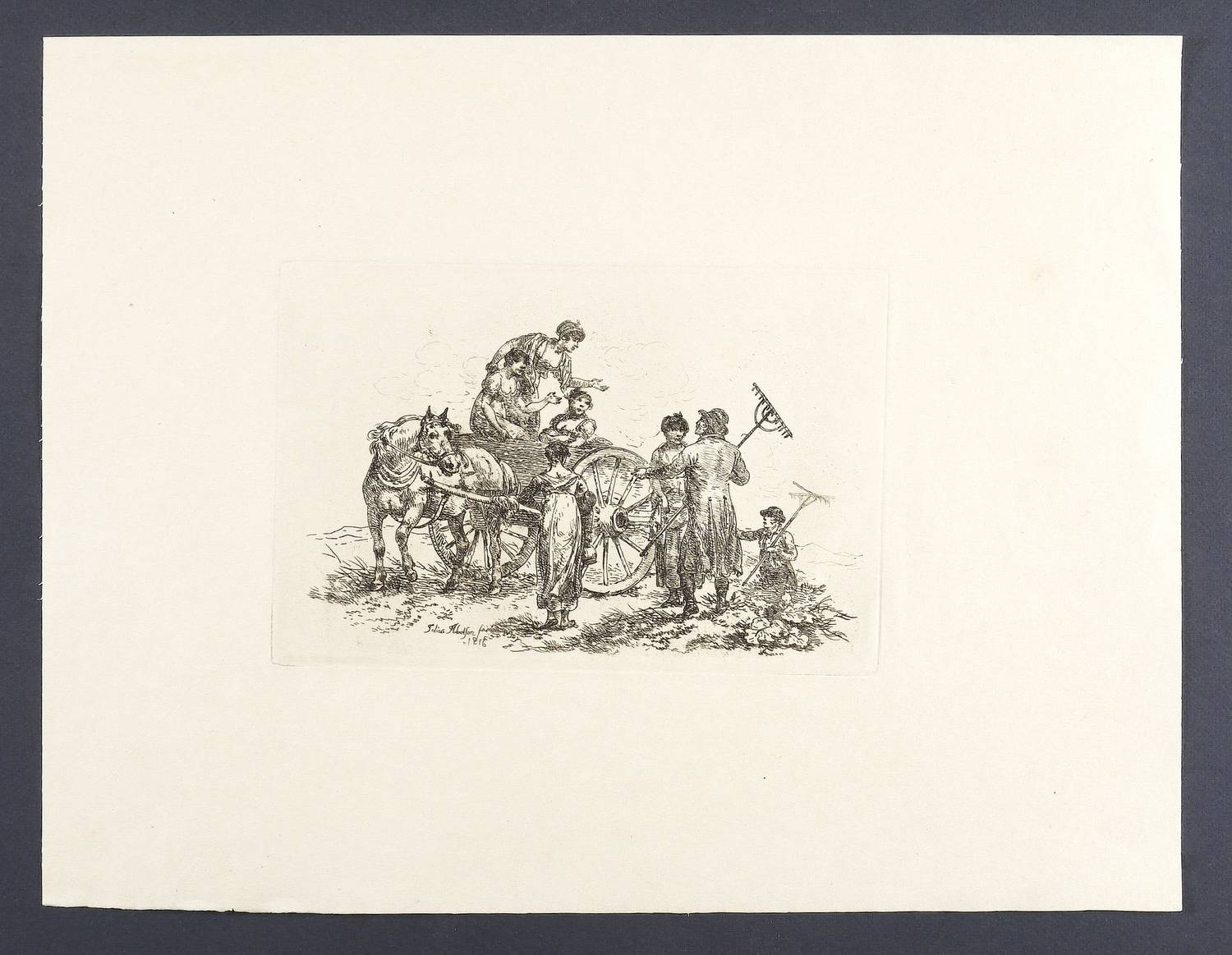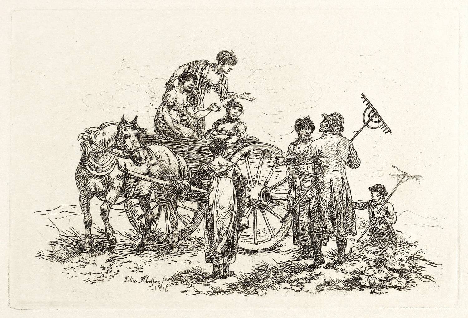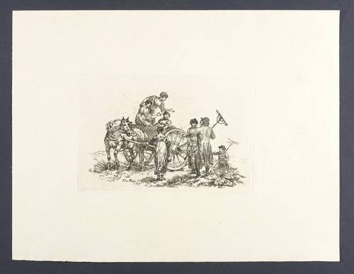 Aus: Julius Caesar Ibbetson, Etchings by the late Julius Caesar Ibbetson consisting of Groups of Cattle, in six plates, and Groups of Rustic Figures, in eight plates (London: Harvey & Darton 1817). – In der Platte links unten signiert und datiert: "Julius Jbbetson fec. May 1816." – Pittoreske Landszene mit einer Gruppe junger Frauen auf einem einachsigen Pferdewagen, mit zwei Heu machenden Bauern scherzend. – Breitrandiges Exemplar. Im rechten Rand ein kleines Fleckchen. Sonst guter Erhaltungszustand.