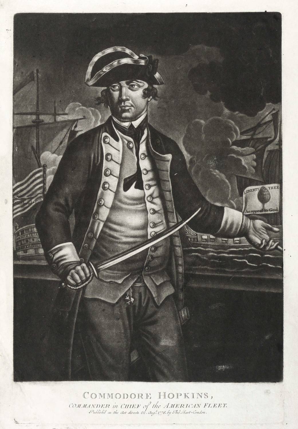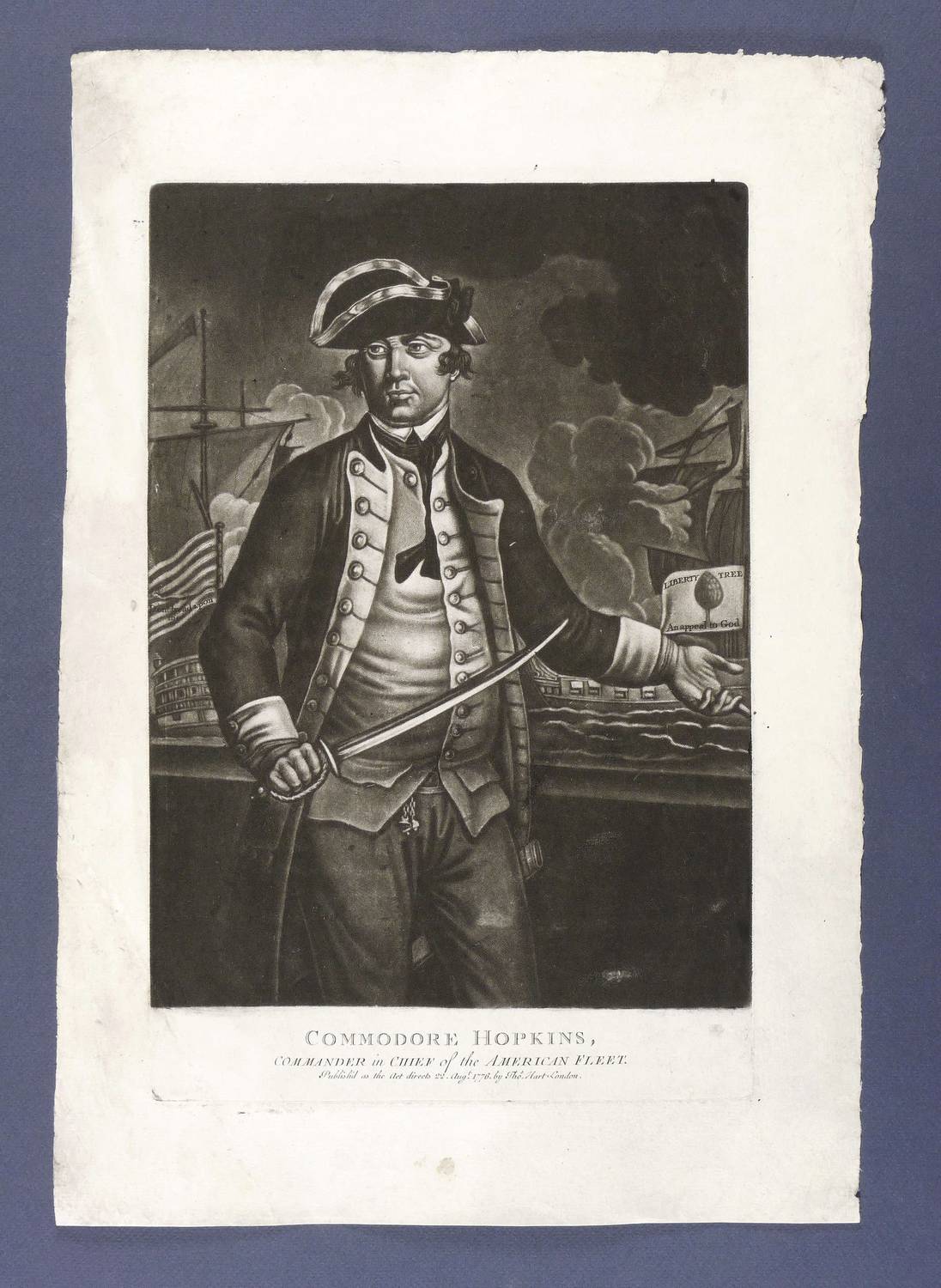 In der Platte unten Titel: ″COMMODORE HOPKINS, COMMANDER in CHIEF of the AMERICAN FLEET.″ Darunter Verlegeradresse: ″Publish'd as the Act directs 22. Aug.t 1776. by Tho.s Hart London.″ In der Darstellung Inschriften, in der Flagge des linken Schiffes: ″Dont tread upon me″. In der Flagge rechts: ″LIBERTY TREE / An appeal to God″. – Der Kommodore steht in Ganzfigur und Uniform mit gezogenem Säbel vor einer Brüstung. Hinter ihm erscheinen zwei Kriegsschiffe, das linke mit der Gadsden Flag mit Klapperschlange, das rechte mit der sog. Liberty Tree Flag oder auch Pine Tree Flag mit Kiefernbaum, beides erste historische US- Flaggen. – Der breite Papierrand stärker beansprucht, fleckig und knickspurig. Insgesamt mäßig guter Zustand.