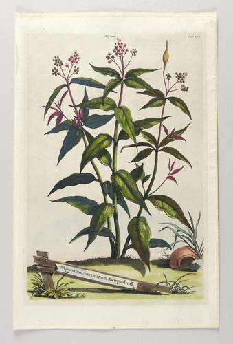 Aus: Abraham Munting, Naauwkeurige Beschryving der Aardgewassen. waar in de veelerley aart en bijzondere eigenschappen der boomen, heesters, kruyden, bloemen met haare vrugten, zaden, wortelen en bollen, neevens derzelver waare voortteeling gelukkige aanwinning, en heylzaame geneeskrachten, na een veel-jarige oeff (Leyden & Utrecht: Pieter van der Aa & Francois Halma 1696). – Auf der Schrifttafel unten in der Darstellung betitelt. Im oberen Plattenrand nummeriert. – Dem Alter entsprechend guter Zustand. Leichter Lichtrand um die Platte. Verso Rahmungsspuren. Insgesamt guter Zustand.