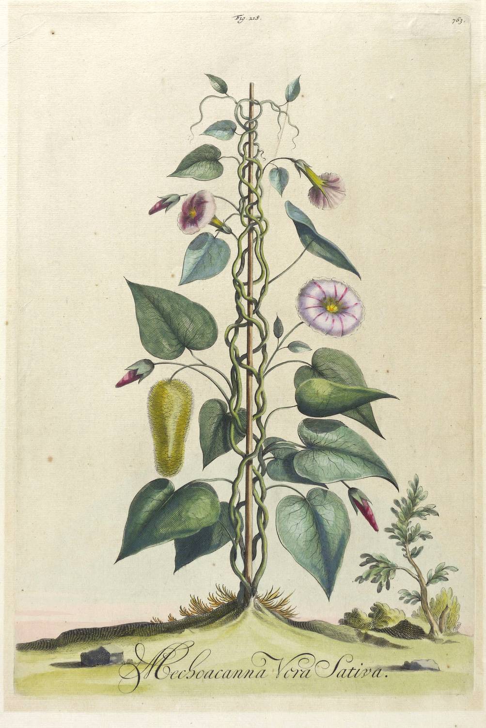 Aus: Abraham Munting, Naauwkeurige Beschryving der Aardgewassen. waar in de veelerley aart en bijzondere eigenschappen der boomen, heesters, kruyden, bloemen met haare vrugten, zaden, wortelen en bollen, neevens derzelver waare voortteeling gelukkige aanwinning, en heylzaame geneeskrachten, na een veel-jarige oeff (Leyden & Utrecht: Pieter van der Aa & Francois Halma 1696). – In der Darstellung unten betitelt. Im oberen Plattenrand nummeriert. – Bei Samuel Hahnemann als Mechoakanwinde (Convolvulus leticucu, Pis. Convolvulus Mechoacanna) beschrieben. – Dem Alter entsprechend guter Zustand. Leichter Lichtrand um die Platte. Verso Rahmungsspuren. Insgesamt guter Zustand.
