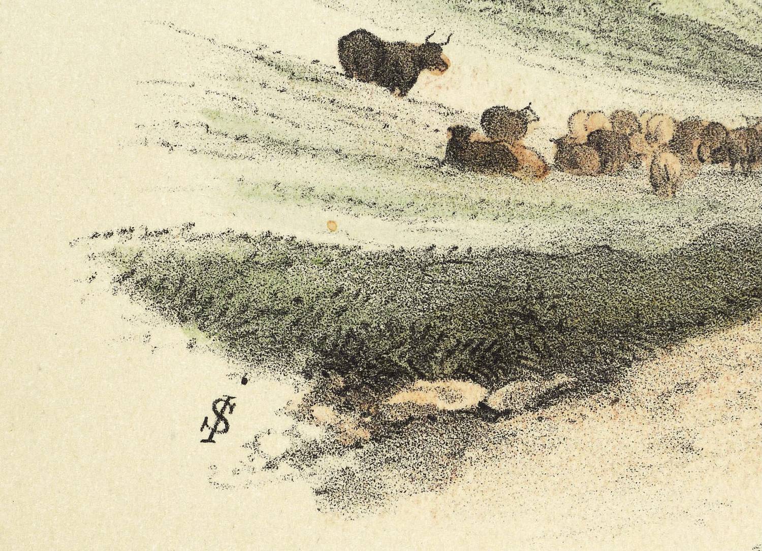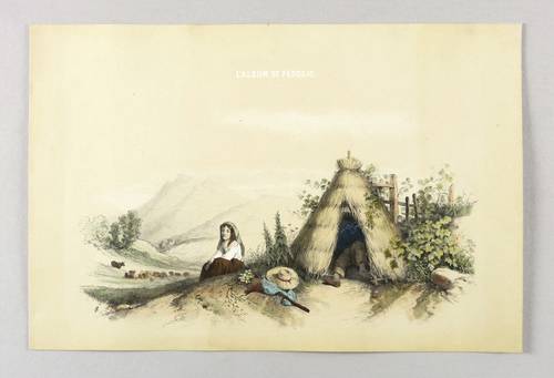 Aus: François-Fortuné-Antoine Férogio, L'album de Ferogio (Paris: Lemercier 1844). – Oben Serientitel: ″L'ALBUM DE FÉROGIO″. Links unten monogrammiert: ″IS″. Sonst nicht näher bezeichnet. – Ländliches Idyll in der Art der französischen Romantik. – Papier altersbedingt leicht gegilbt. Insgesamt schönes Erscheinungsbild und guter Zustand.