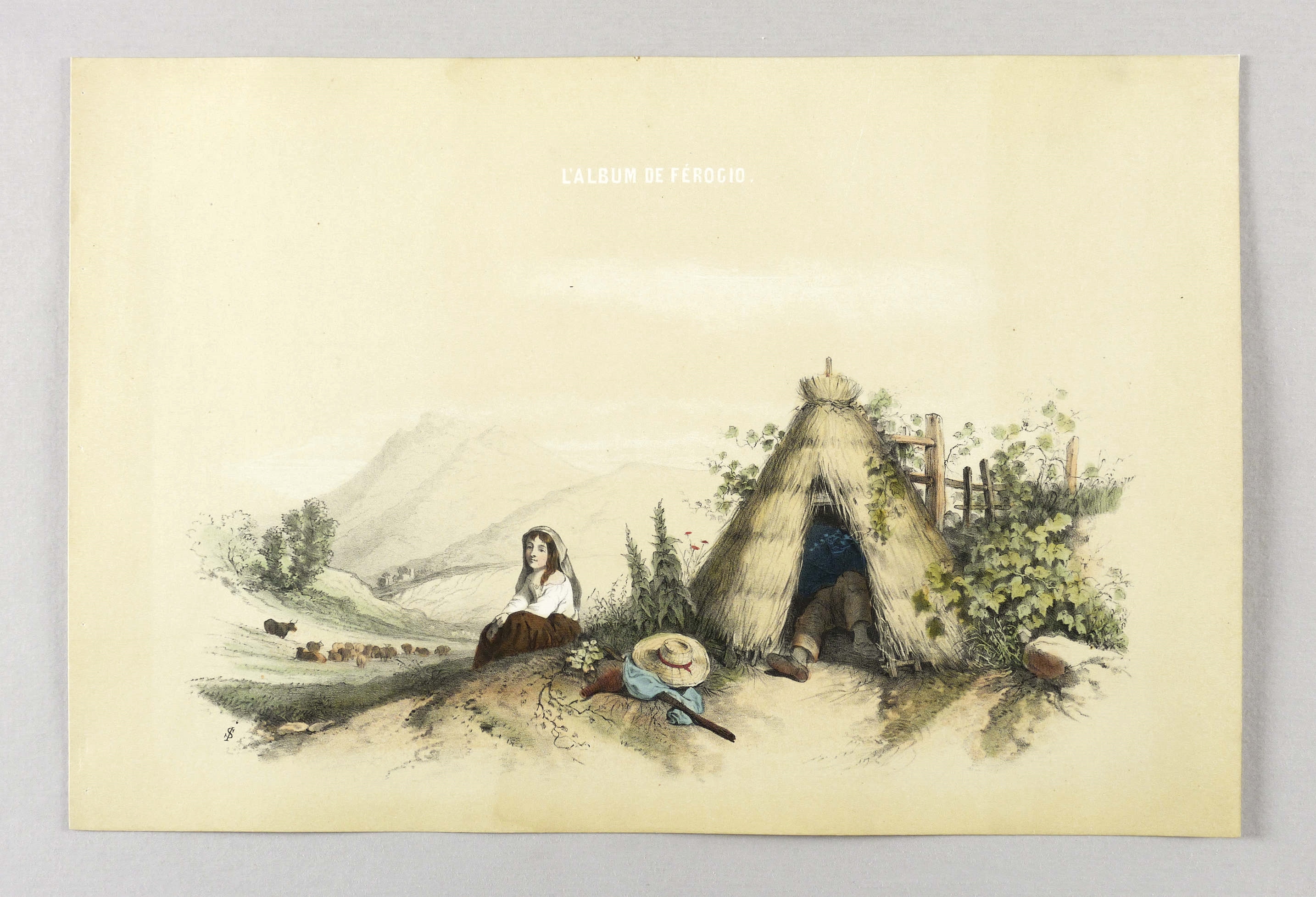 Aus: François-Fortuné-Antoine Férogio, L'album de Ferogio (Paris: Lemercier 1844). – Oben Serientitel "L'ALBUM DE FÉROGIO", links unten monogrammiert "IS". Sonst nicht näher bezeichnet. – Ländliches Idyll in der Art der französischen Romantik. – Papier altersbedingt leicht gegilbt. Insgesamt schönes Erscheinungsbild und guter Zustand.
