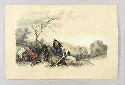 Aus: François-Fortuné-Antoine Férogio, L'album de Ferogio (Paris: Lemercier 1844). – Oben Serientitel: ″L'ALBUM DE FÉROGIO″. Links unten monogrammiert: ″IS″. Sonst nicht näher bezeichnet. – Hilfe suchender Kutscher bei einem Hirten. – Papier altersbedingt leicht gegilbt. Insgesamt schönes Erscheinungsbild und guter Zustand.