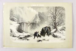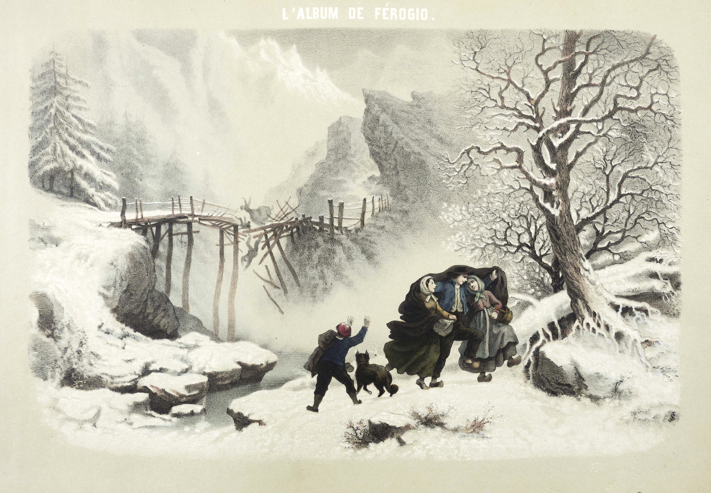 Aus: François-Fortuné-Antoine Férogio, L'album de Ferogio (Paris: Lemercier 1844). – Oben Serientitel ″L'ALBUM DE FÉROGIO″. Rechts unten monogrammiert ″JS″. Sonst nicht näher bezeichnet. – Winterliche Alpenlandschaft. Im Vordergrund heitere Szene eines Bauernburschen, der zwei Mägde zum Wärmen mit unter seine Decke nimmt. Im Hintergrund gleichzeitig eine vom Unglück heimgesuchte Familie, die von einer zerbrechenden Holzbrücke in ein tiefes Flußtal hinabstürzt. – Originalrandiges Exemplar, Papier altersbedingt leicht gegilbt. Insgesamt schönes Erscheinungsbild und guter Zustand.