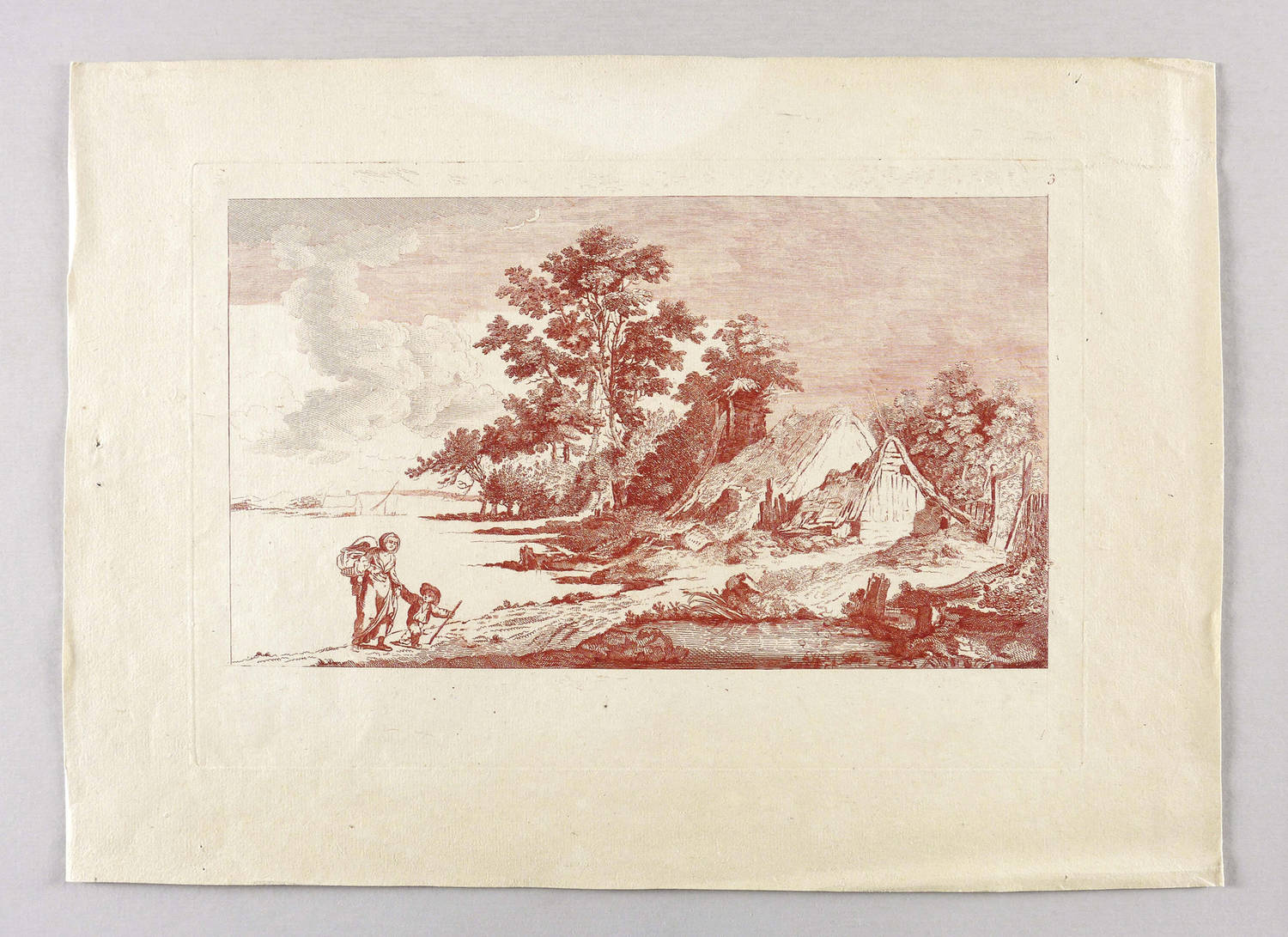 Um 1770. Radierung / Strichätzung, in Rötelton, auf Bütten. – Originale Künstlergrafik, von Französisch (18. Jh.). – Probedruck. – 16,7 x 29,1 cm (Darstellung / Einfassungslinie), 21,6 x 31,7 cm (Platte), 29,5 x 41,5 cm (Blatt).