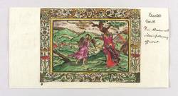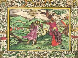 1560-1580. Holzschnitt, alt koloriert. – Historische Buchillustration, von Monogrammist MT. – 7,5 x 11,0 cm (Darstellung / ohne Schmuckrahmen), 10,7 x 14,5 cm (Blatt), 12 x 23 cm (Trägerblatt).