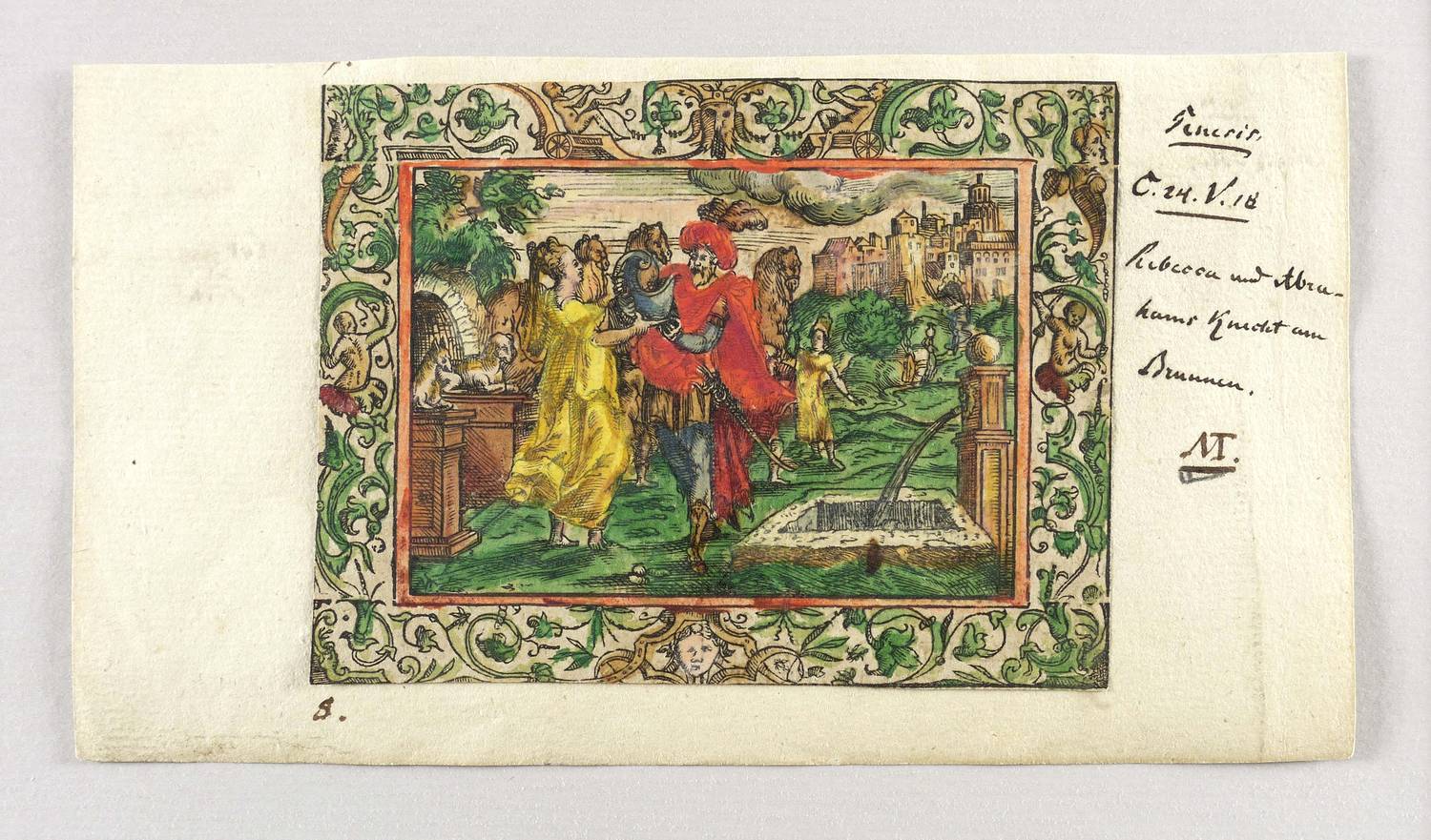 Im Druckstock in der Darstellung links unten signiert mit Monogramm und Signet MT und Messerchen. Auf dem Trägerbütten alt in brauner Feder bezeichnet: ″Genesis. C. 24. V. 18. / Rebecca und Abrahams Knecht am Brunnen. / MT.″ Verso typografischer Rückentext aus der Biblia deutsch von Martin Luther. – Zeittypische Bordüre mit Grotesken und Rollwerk. - Aus einer deutschen Ausgabe der Lutherbibel der 2. Hälfte des 16. Jahrhunderts. Sämtliche Holzschnitte wohl von einer Hand, oft Bilderfindungen des Virgil Solis folgend, bisweilen mit Monogramm MT und Messerchen signiert. – Bis auf den Rand der Schmuckrahmung beschnitten. Papier altersbedingt etwas gebräunt. Alt auf Büttenpapier des 18. Jh. gesetzt. Insgesamt gut erhalten.