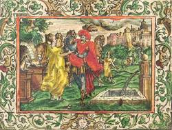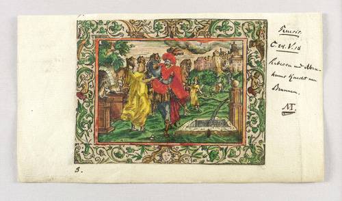 1560-1580. Holzschnitt, alt koloriert. – Historische Buchillustration, von Monogrammist MT. – 7,8 x 11,0 cm (Darstellung / ohne Schmuckrahmen), 10,9 x 14,4 cm (Blatt), 13 x 23 cm (Trägerblatt).