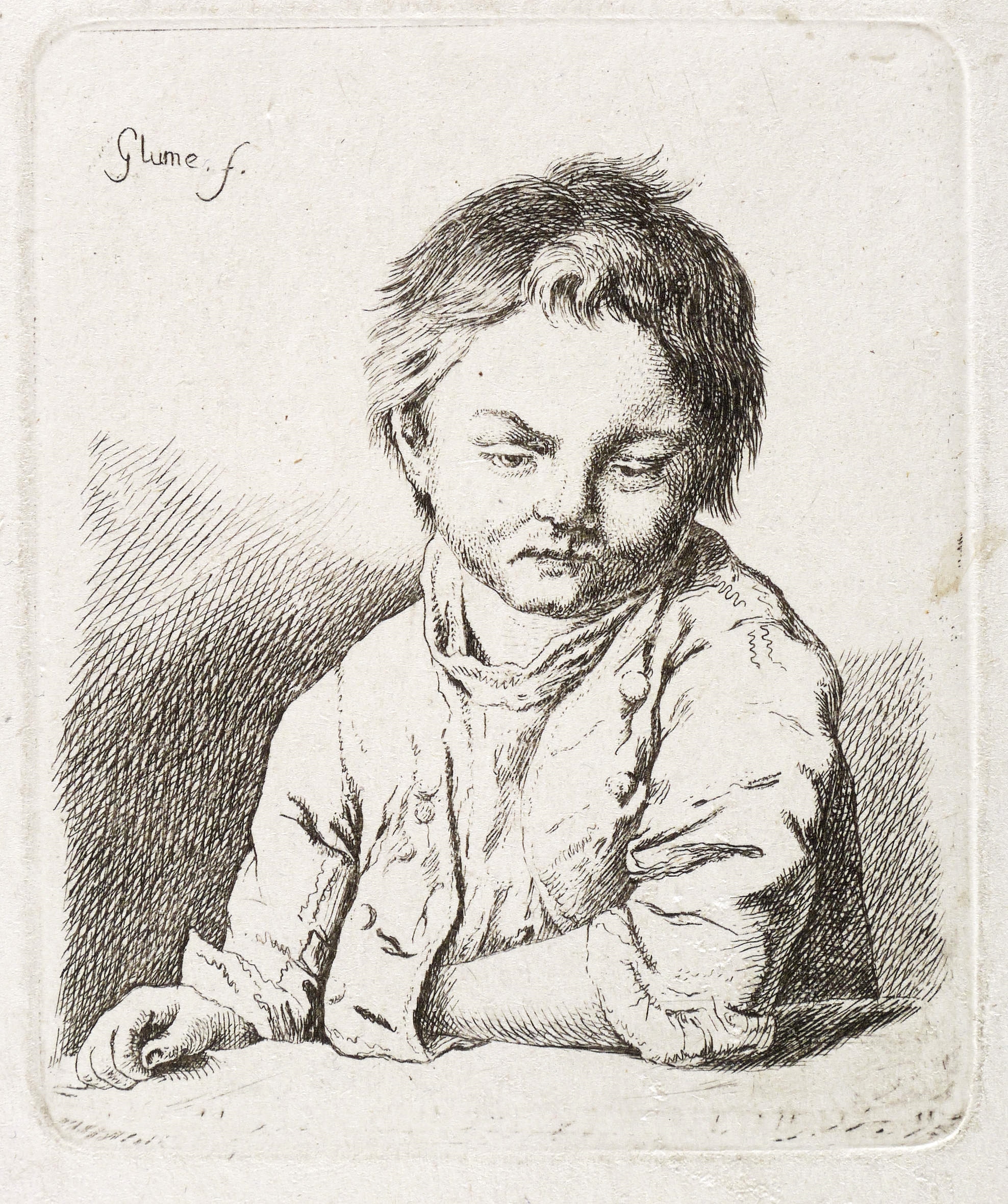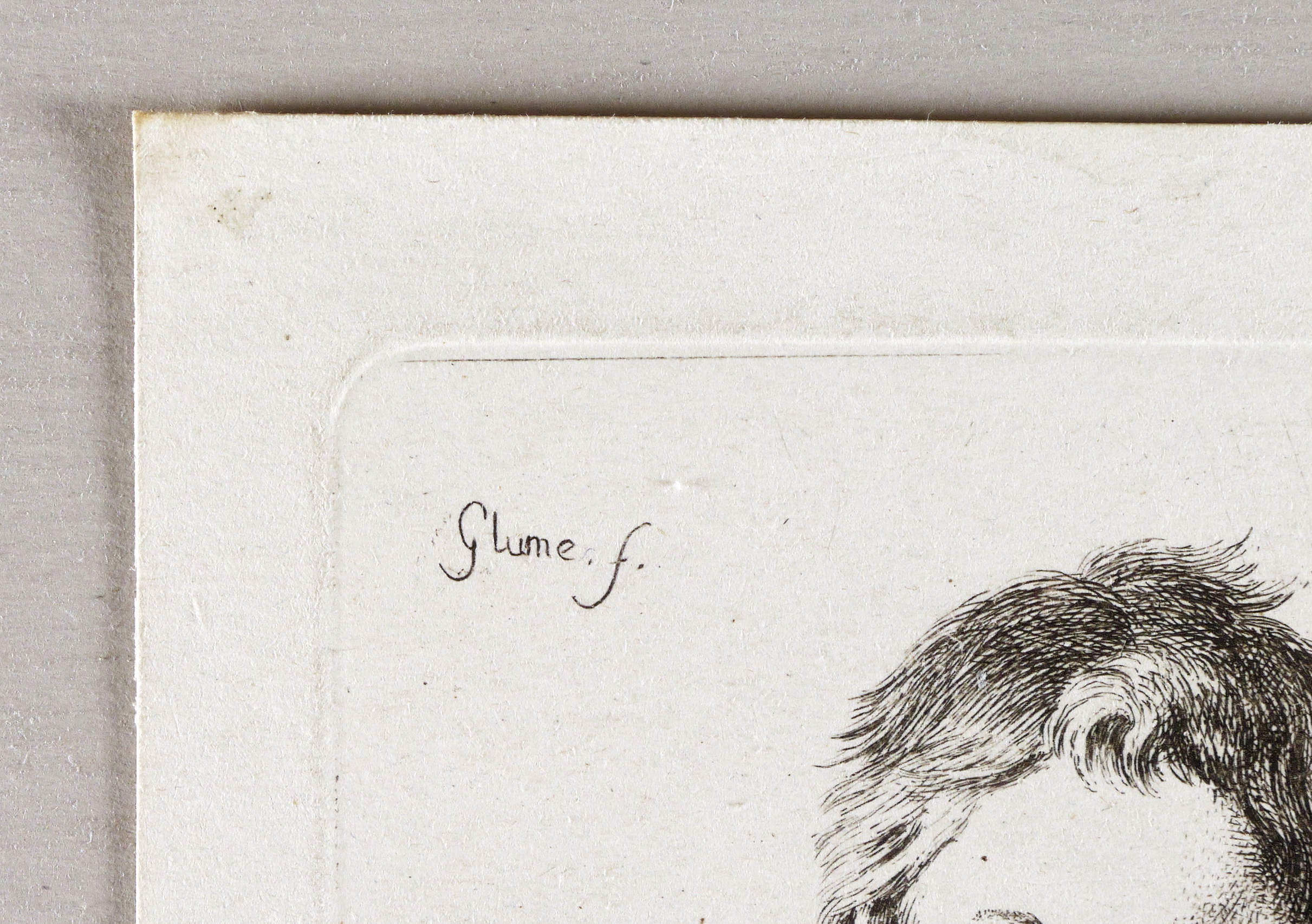 Johann Gottlieb Glume (1711 Berlin - 1778 Berlin). Deutscher Maler und Radierer. Schüler von Johann Harper. Einige Jahre Schüler und Mitarbeiter im Atelier von Antoine Pesne. Malte v.a. Landschaften und Bildnisse. 1746 Deckengemälde der kleinen Galerie von Schloss Sanssouci in Potsdam. Ab 1764 Mitglied der Berliner Akademie der Künste. Das zahlenmäßig überschaubare Radierwerk beschäftigt sich motivisch v.a. mit Kinderbildnissen und Bildnissen aus dem Familien- und Freundeskreis.