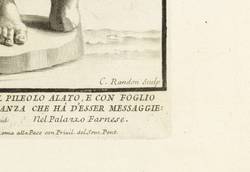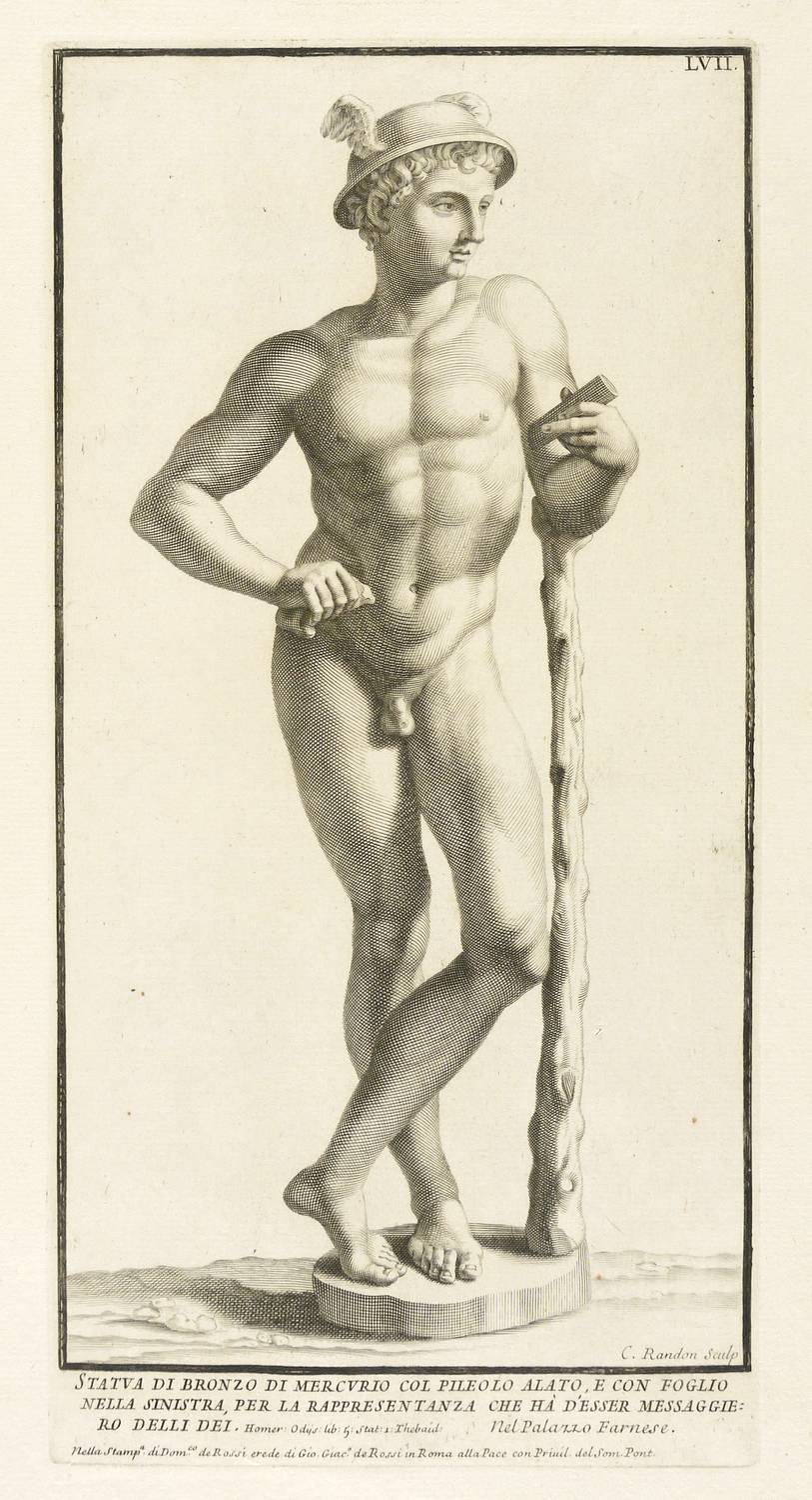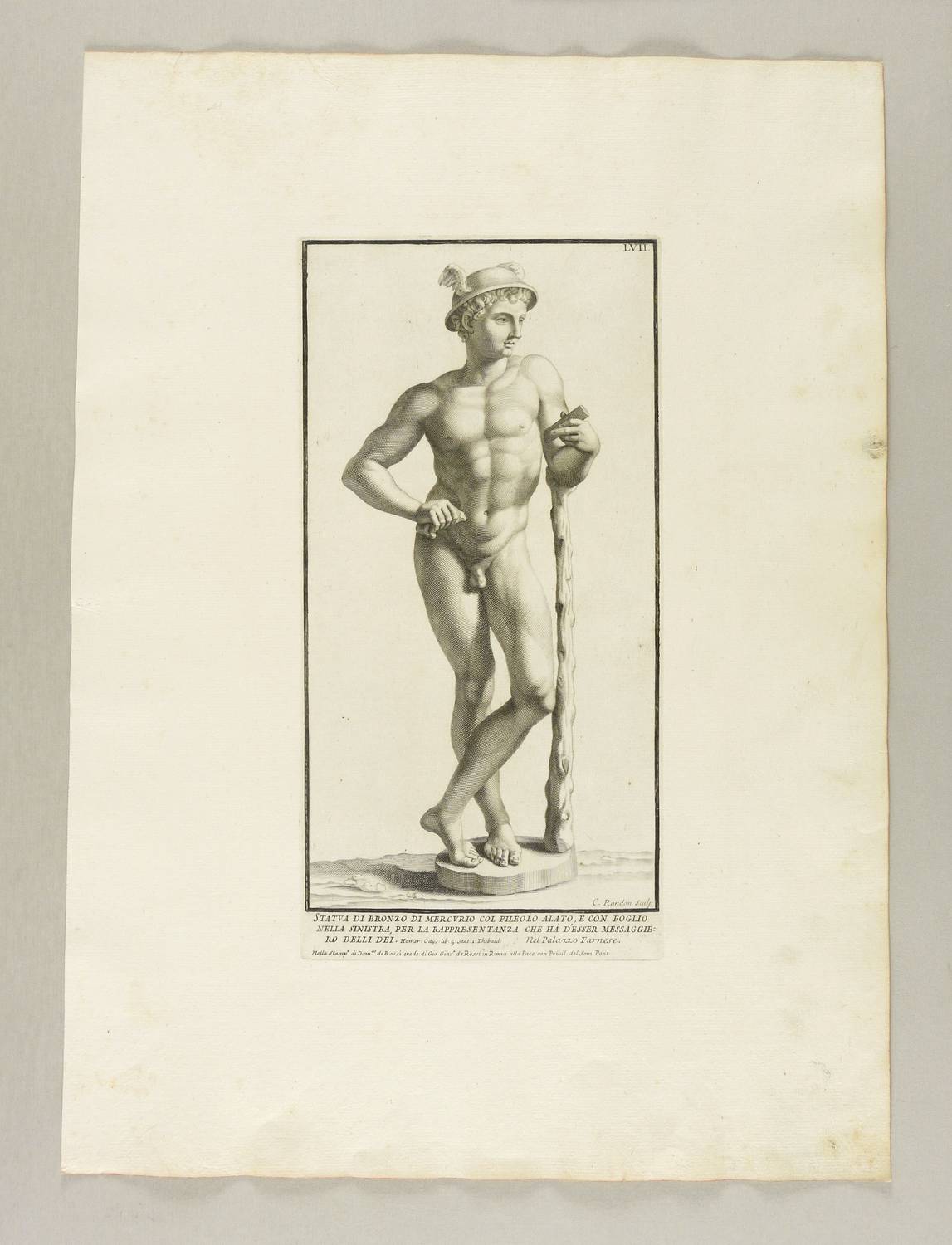 Aus: Paolo Alessandro Maffei, Raccolta di statue antiche e moderne (Rom: Stamperia alla Pace 1704). – Rechts unten signiert: „C. Randon Sculp“. Unterhalb der Darstellung betitelt. – Blatt teils schwach braun- und fingerfleckig. Sonst guter Zustand.