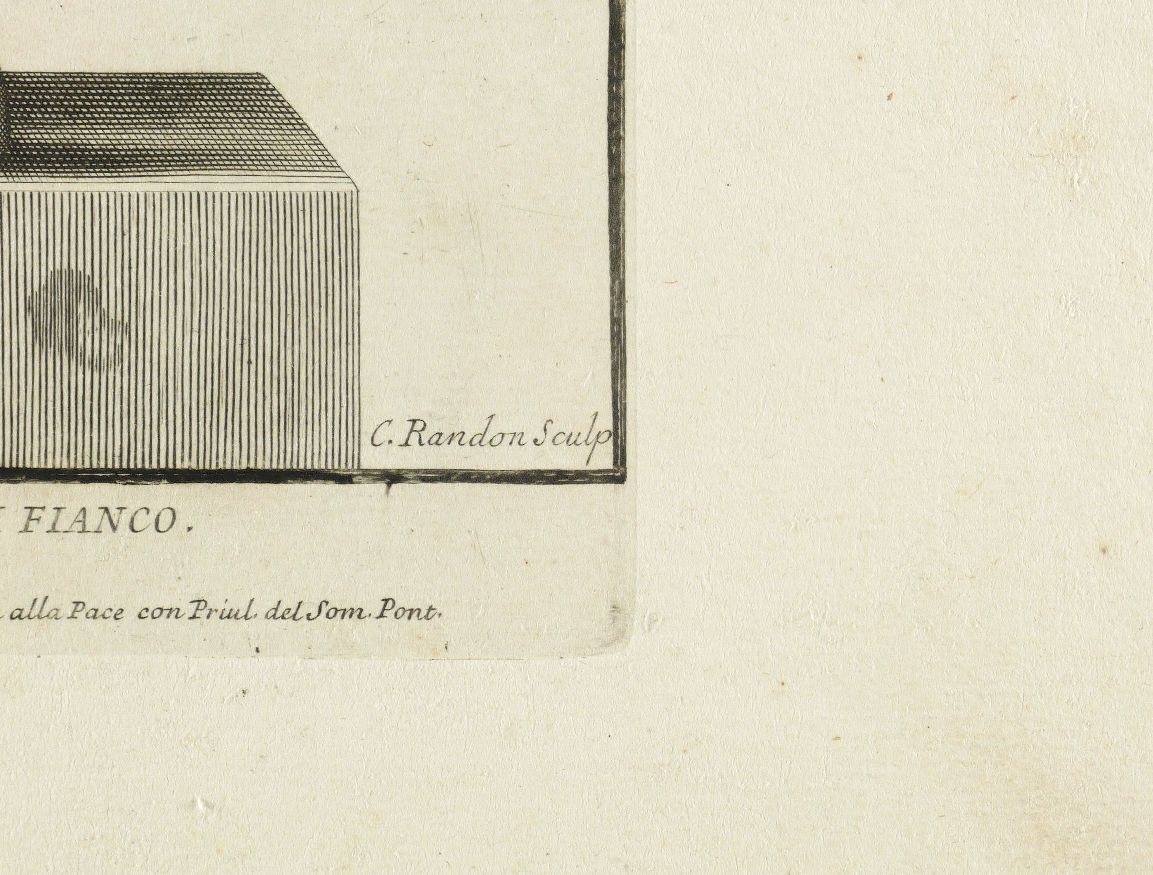 Aus: Paolo Alessandro Maffei, Raccolta di statue antiche e moderne (Rom: Stamperia alla Pace 1704). – Rechts unten signiert: „C. Randon Sculp“. Unterhalb der Darstellung betitelt. – Blatt im rechten Rand leicht angestaubt. Sonst guter Zustand.