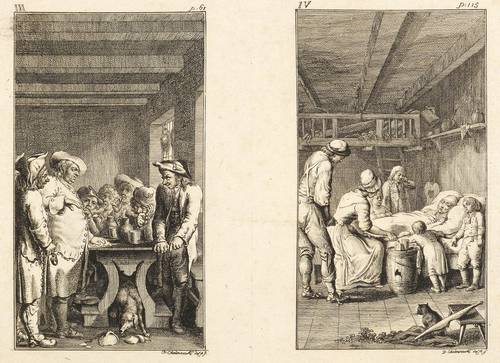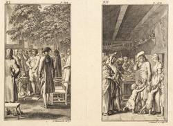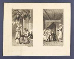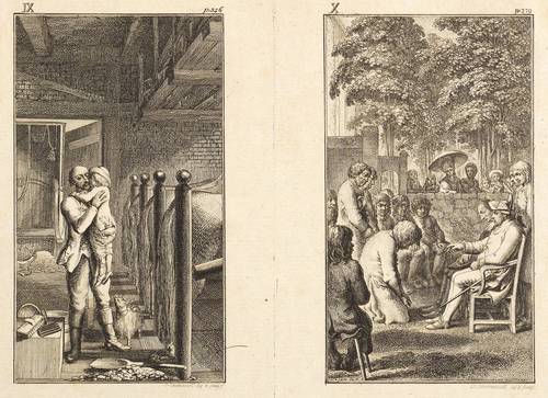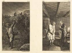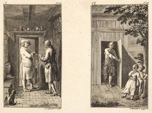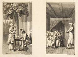 Bauer 950-961. Engelmann 444-455. – Aus: Leonard et Gertrude ou les moeurs villagegoises ... (Berlin: Georg Jacob Decker 1783). – Blatt Nr. II in der Platte rechts unten signiert und datiert: ″D. Chodowiecki del. & sc. 1782″. – Komplette Serie von 12 Tafeln auf 6 Platten, ungeschnitten und ungebunden. – Blätter mit unterschiedlich breiten Rändern um die Platten. Guter Zustand.