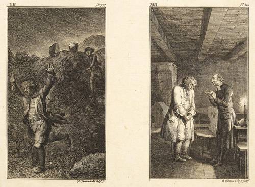 Daniel Nikolaus Chodowiecki (1726 Danzig - 1801 Berlin). Deutscher Kupferstecher, Grafiker und Illustrator. Bedeutender Vertreter der Kunst des Deutschen Klassizismus. Begann 1740 zunächst eine kaufmännische Lehre. Ab 1743 in der Haushaltswarenhandlung seines Onkels Antoine Ayrer in Berlin tätig. Letzterer unterstützte seine und seines Bruders Gottfried künstlerische Ausbildung und ließ beide von Johann Jakob Haid, Bernhard Rode und Johann Heinrich Meil unterrichten. Von den Ladengeschäften befreit, konnten sie sich 1754 mit Miniaturen und Emailmalereien selbstständig machen. Seit 1758 erste Radierversuche in allerlei Techniken wie Strichätzung, Aquatinta und Crayon-Manier. Frühe Verbindungen zu Verlegern von Almanachen und Kalendern beförderten diese Entwicklung. Vielbeschäftigt hat er Berlin nur selten verlassen. Eine längere Reise zu seiner Mutter nach Danzig im Jahre 1773 schlug sich dann entsprechend intensiv in seiner Arbeit nieder. Seit 1764 Mitglied der Königlich-Preußischen Akademie der Künste, ab 1797 deren Direktor.