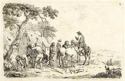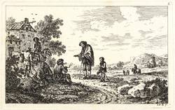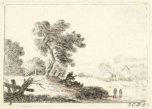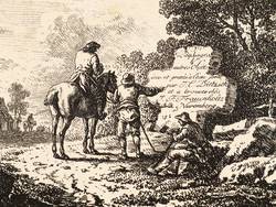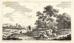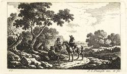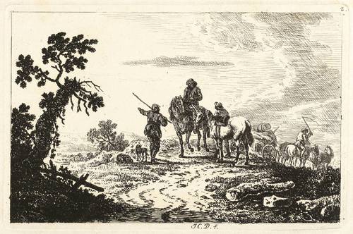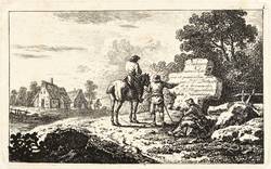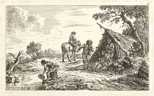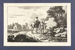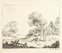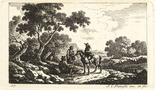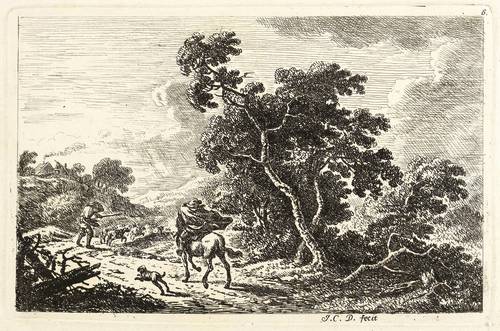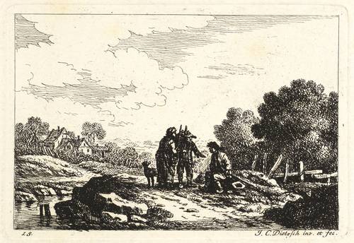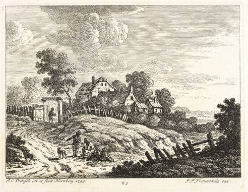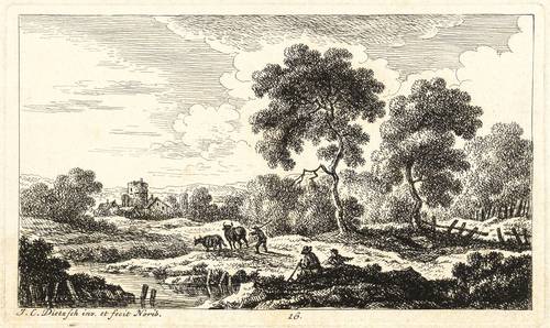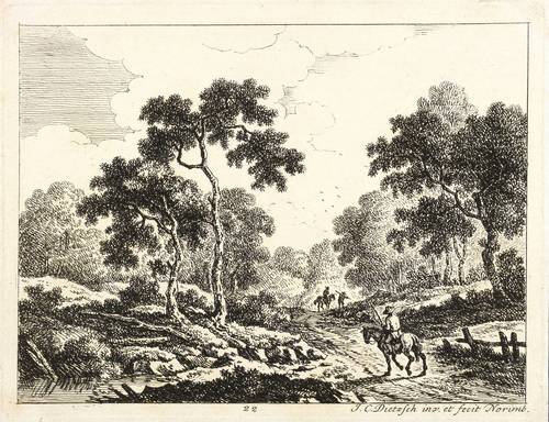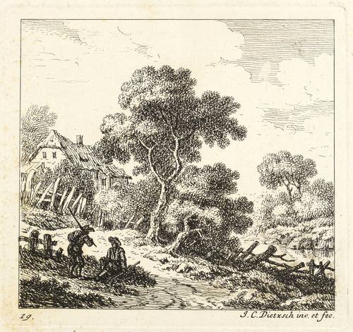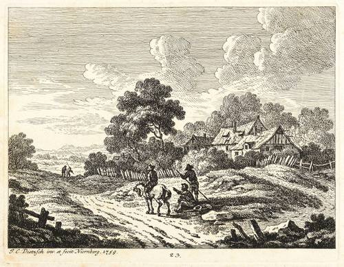 Aus: Johann Christoph Dietzsch, Paysages & autres Sujets (Nürnberg: Frauenholz 1759/1760). – Das Titelblatt mit dem Titel auf dem Steinkreuz rechts: ″Paysages & autres Sujets / inv. et gravés à l'eau forte / par J.C. Dietzsch / et a trouver chéz / J.F. Frauenholtz / a Nuremberg.″ Die anderen Blätter jeweils in den Platten signiert und bezeichnet, bisweilen auch datiert. – Vollständige sogenannte Frauenholz-Ausgabe der Dietz'schen Radierungen gemischten Inhalts. – Komplette Folge mit durchgehend leichten bis unscheinbaren Lagerspuren. Selten bestoßen bzw. knickspurig. Insgesamt noch sehr guter Erhaltungszustand.