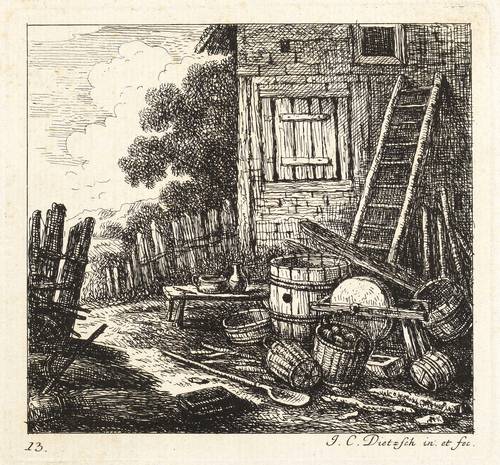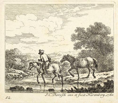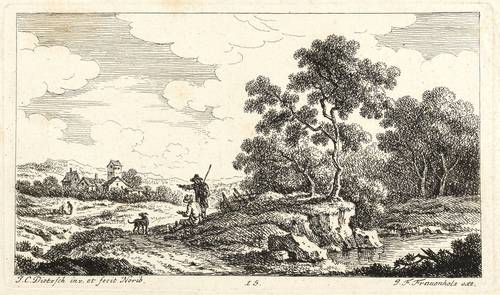 Johann Christoph Dietzsch (1710 Nürnberg - 1769 Nürnberg). Deutscher Maler und Radierer. Entstammt einer weitläufigen Nürnberger Künstlerfamilie, u.a. Vater Johann Israel Dietzsch sowie die Schwester Barbara Regina Dietzsch. Malte und radierte bevorzugt Landschaften mit ländlicher Staffage. Veröffentlichte mehrere Kupferstichfolgen, darunter bei Knorr eine Serie mit sechs großen Landschaftsradierungen, eine Serie mit 41 kleineren Blättern, die er mit Hilfe des Bruders Johann Albrecht herausgab, elf Blätter mit Darstellungen der Stadt Nürnberg sowie dreißig Blätter mit Künstlerportraits. Zudem fertigte er Blumen- und Genrestücke im niederländischen Stil in Aquarell- und Deckfarben. Maria Catharina Prestel stach nach ihm eine Folge von sechs Blättern mit Landschaften. Seinerzeit bekannt war das von ihm errichtete Naturalien- und Kuriositätenkabinett.