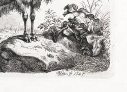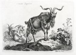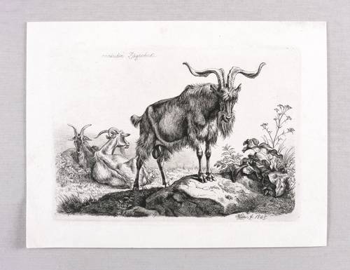 Jahn 337 II. – In der Platte rechts unten signiert und datiert: ″JAKlein f. 1845″. Links oben betitelt: ″römischer Ziegenbock″. – Bei Jahn beschrieben als: ″Nach rechts etwas von vorn gesehen und mit den Vorderfüssen auf einem Stein vor einer grosblättrigen Pflanze stehend; hinter demselben zwei im Gras liegende Ziegen.″ – Leichte Lagerspuren. Guter Zustand.