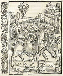Aus: Jodocus Badius Ascensius, Navis stultifera (Basel: Nicolaus Lamparter 1507). – Unterhalb der Darstellungen typografischer Text: ″Neq[ue] sellam: neq[ue] calcar: neq[ue] frenum″. Oberhalb bezeichnet: ″De improuidis et inconsideratis″. – Blatt XIII verso mit einem Holzschnitt aus der Baseler Ausgabe des Narrenschiff von Badius Ascensius nach Sebastian Brant von 1507. – Darstellung eines Narren, dessen mangelnde Vorsicht und Vorbereitung veranschaulicht wird, indem er auf einem Esel reitet, ungesattelt, ohne Steigbügel und Zügel. – Originalrandiges Exemplar. Papier mit geringfügigen Alterspuren. Durchaus guter Erhaltungszustand.