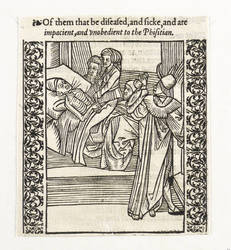 Aus: Sebastian Brant, Stultifera Navis. The ship of fooles (London: John Cawood 1570). – Oberhalb der Darstellung typografischer Text: ″Of them that be diseased, and sicke, and are impacient, and vnoedient to the Phisitian″. – Satirische Holzschnitt-Illustration aus der Londoner Ausgabe des Narrenschiffs von Sebastian Brant von 1570 bei John Cawood. – Die Holzschnitt-Illustrationen wurden erstmals in Richard Pynsons englischer Ausgabe von 1509 gedruckt. Es handelt sich mit wenigen Ausnahmen um Kopien der Dürer- Holzschnitte der Erstausgabe von 1494, die vermutlich von einem französischen Formschneider für Pierre Rivières Ausgabe von 1497 angefertigt wurden. – Umlaufend auf die Rand von Schmuckrahmen und Text beschnitten. Im Passepartout montiert. Guter Erhaltungszustand.