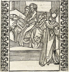 1509. Holzschnitt, in Schwarz, auf Bütten. – Historische Buchillustration, von Französisch (15. Jh.). – 11,1 x 8,0 cm (Darstellung / ohne Schmuckrahmen), 12,7 x 11,1 cm (Blatt), 11,2 x 10,5 cm (Darstellung / mit Schmuckrahmen).