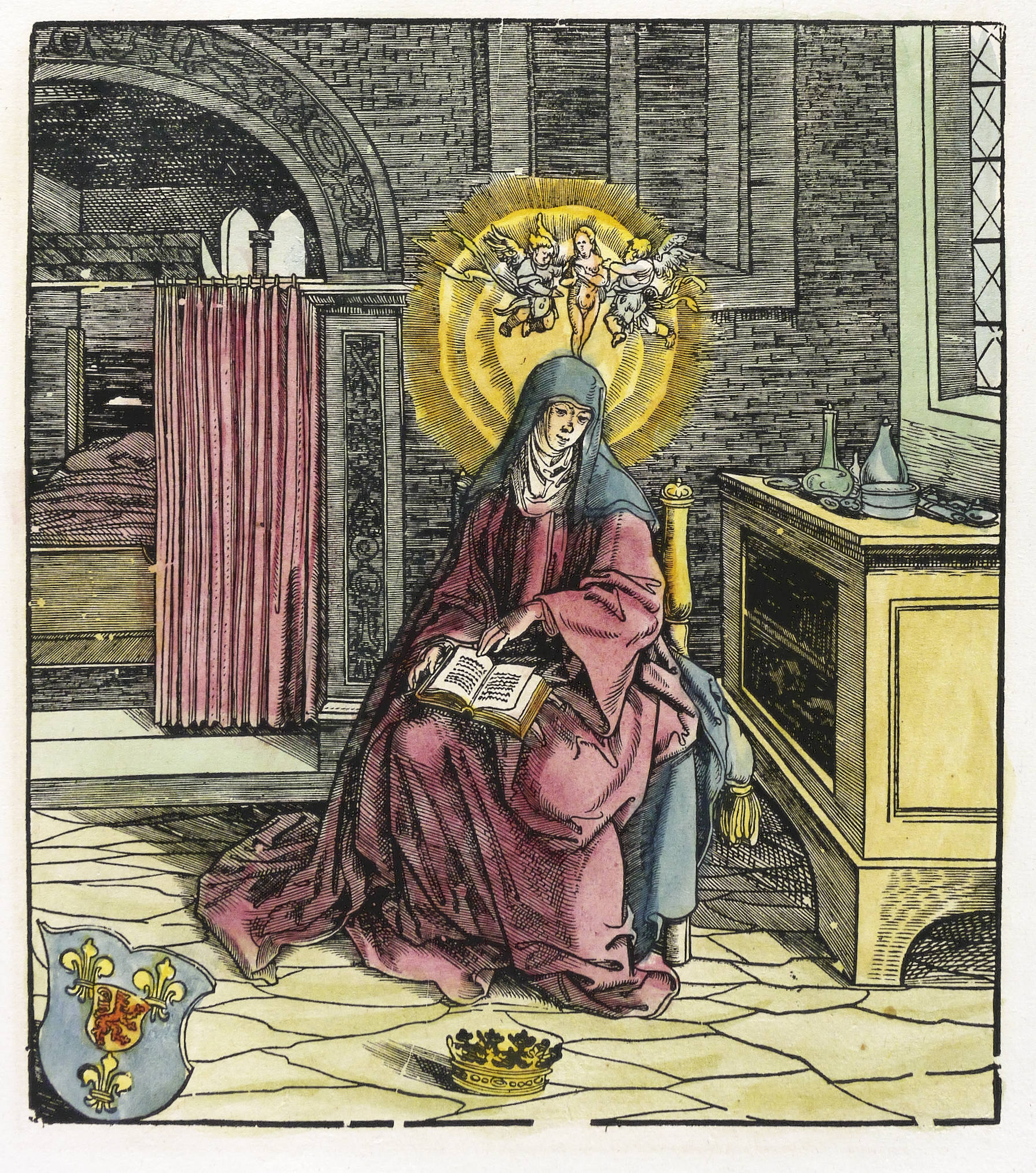 Aus: Hans Burgkmair d.Ä., Images de Saints et Saintes issus de la famille de l'Empereur Maximilien I. (Wien: F.X. Stöckl 1799). – Rechts oben paginiert: ″96″. – Blatt aus dem kaiserlichen Holzschnitt-Werk zu den Heiligen aus der Familie Maximilians I. Die zwischen 1516 und 1518 entstandenen Holzstöcke wurden erstmals 1799 in Wien gedruckt. – Originalrandiges Papier. Wenige Alterspuren. Sehr guter Zustand.