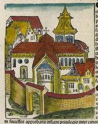 1493. Holzschnitt, in Schwarz, alt koloriert, auf Bütten. – Historische Ortsansicht, von Deutsch (15. Jh.). – 13,9 x 10,9 cm (Darstellung / Druckstock), 43 x 30 cm (Blatt).