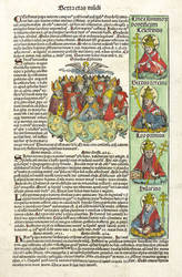 Aus: Hartmann Schedel, Liber chronicarum [Weltchronik]. Registrum huius operis libri cronicarum cu[m] figuris et ymagi[ni]bus ab inicio mu[n]di (Nürnberg: Anton Koberger 1493). – Rechts neben der Darstellung typografischer Begleittext: ″... apud senam ethrurie urbem (...)″. Umlaufend und verso weiterer lateinsicher Text. – Blatt CCXXXI mit 2 Seiten, 4 kolorierten Holzschnitten, neben der phantastischen Stadtansicht von Etrurien oder der etruskischen Städte noch 3 Herrscher- Bildnisse ″Johan[n]es franc[..] rex″, ″Linea summo[..] pontifici Urbanus quitnus″ und ″Gregorius vindecimus″. – Die unteren Ecken etwas fingerfleckig. Insgesamt sehr gut erhalten.