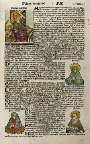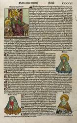 Aus: Hartmann Schedel, Liber chronicarum [Weltchronik]. Registrum huius operis libri cronicarum cu[m] figuris et ymagi[ni]bus ab inicio mu[n]di (Nürnberg: Anton Koberger 1493). – Oberhalb der Darstellung typografischer Text: ″Synodus Ephezina″. Umlaufend und verso weiterer lateinsicher Text. – Schematische Darstellung vom Konzil von Ephesos (431), dem dritten allgemeinen Konzil der Kirche (auch Drittes Ökumenisches Konzil). – Blatt CXXXVI mit 2 Seiten, 6 kolorierten Holzschnitten, neben der Darstellung der Synode noch 4 Papst- Bildnisse ″Celestinus″, ″Sixtus tercius″, ″Leo primus″ und ″Hilarius″. Dazu Bildnisse von ″Sanctus Augustinus″, ″Monica″, Proba mulier″ und ″Eurosina″. – Insgesamt sehr gut erhalten.