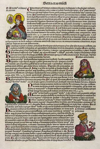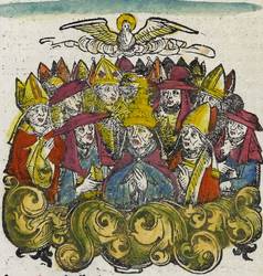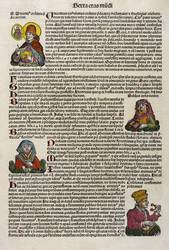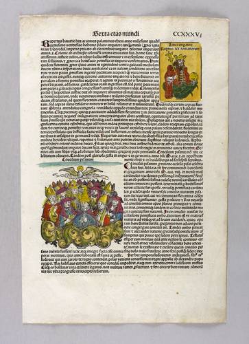 Aus: Hartmann Schedel, Liber chronicarum [Weltchronik]. Registrum huius operis libri cronicarum cu[m] figuris et ymagi[ni]bus ab inicio mu[n]di (Nürnberg: Anton Koberger 1493). – Oberhalb der Darstellung typografischer Text: ″Concilium pisanum″. Umlaufend und verso weiterer lateinsicher Text. – Schematische Darstellung vom Konzil von Pisa (1409). – Blatt CCXXXVI mit 2 Seiten, 6 kolorierten Holzschnitten, neben der Darstellung der Synode noch die Bildnisse ″Linea imperator Ruptus rex romanorum″, S. Vincenti ordinis dicatorum″, Baldus iuris doctor″, ″Nicolaus florentinus medicus″ und ″Crisoloras constantino politanus″. – Sehr guter Zustand.