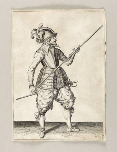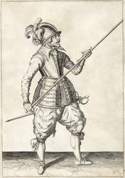 Aus: Wapenhandelinghe van Roers, Musquetten ende Spiessen. Achtervolghende de ordre van [...] Maurits Prince van Orangie [...] Figuirlyck afghebeelt door Iacob de Geyn (Amsterdam: Robert de Baudous 1608). – Blatt bis an, teils auf den Plattenrand beschnitten. Verso mit Montageresten. Insgesamt mäßig guter bis guter Zustand.