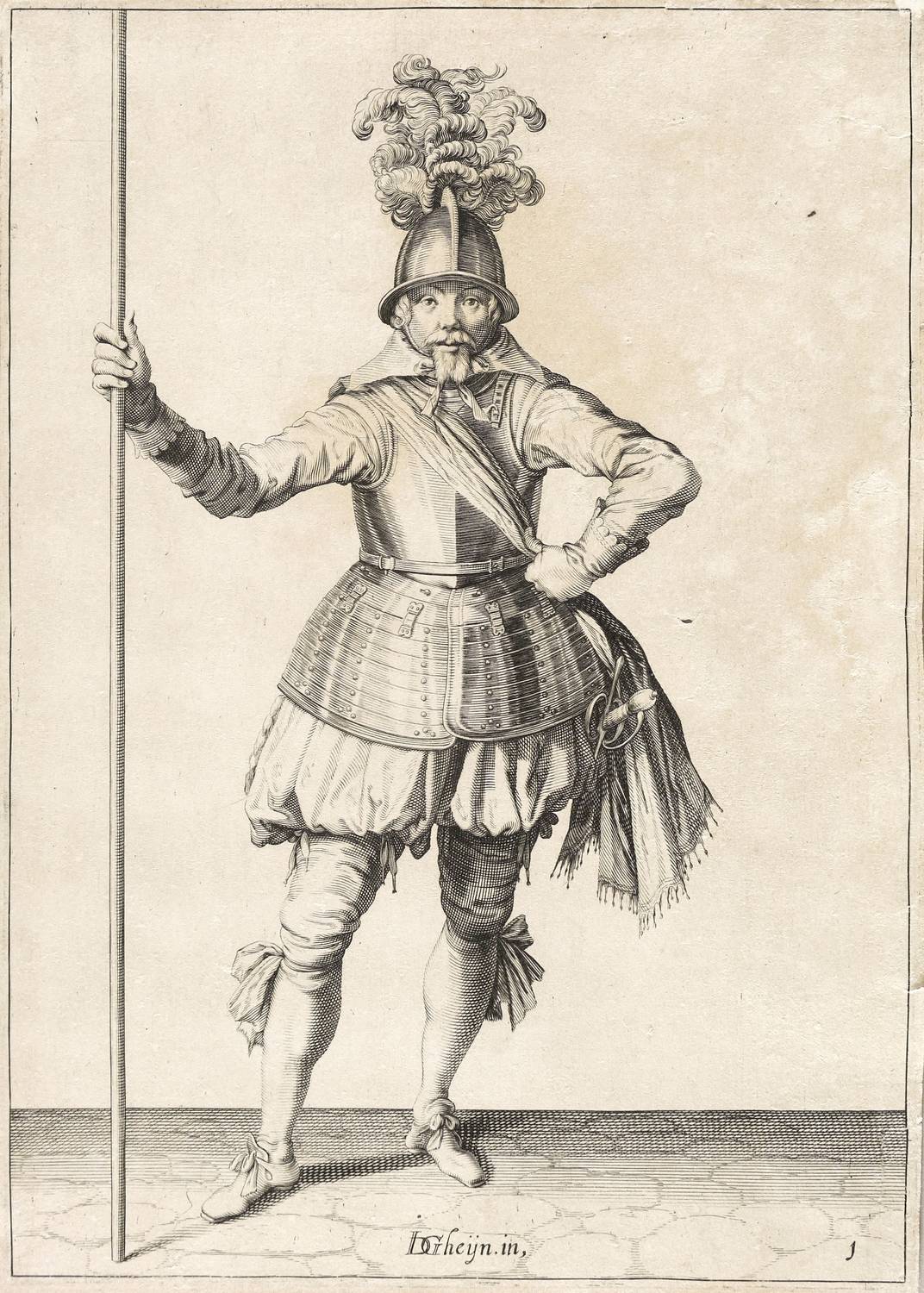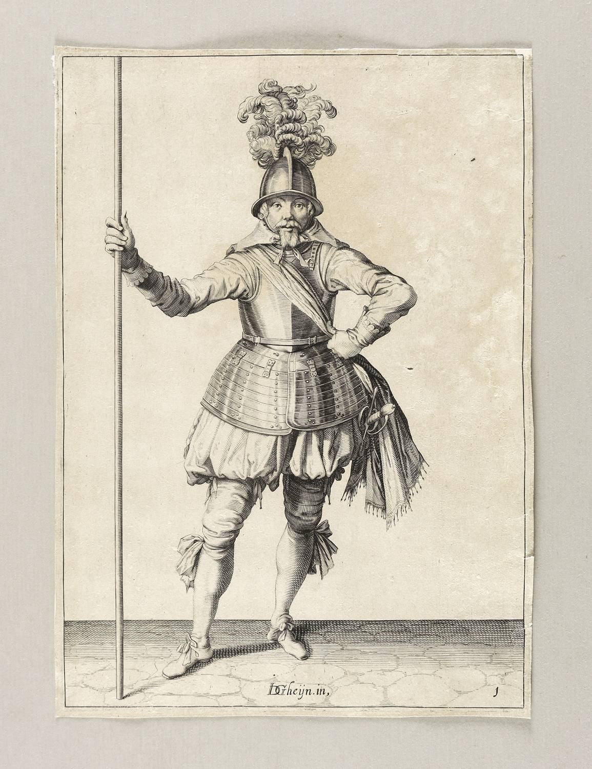 Aus: Wapenhandelinghe van Roers, Musquetten ende Spiessen. Achtervolghende de ordre van [...] Maurits Prince van Orangie [...] Figuirlyck afghebeelt door Iacob de Geyn (Amsterdam: Robert de Baudous 1608). – Unten in der Darstellung bezeichnet: ″D Gheyn. in.″ und rechts nummeriert: ″1″. – Blatt bis an, teils auf den Plattenrand beschnitten. Verso mit Montageresten. Kleinere Einrisse im rechten Rand. Insgesamt mäßig guter bis guter Zustand.
