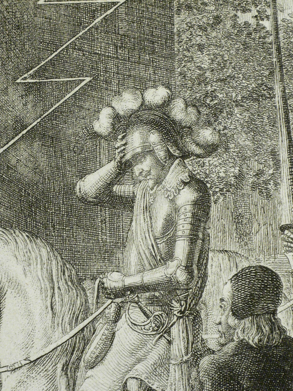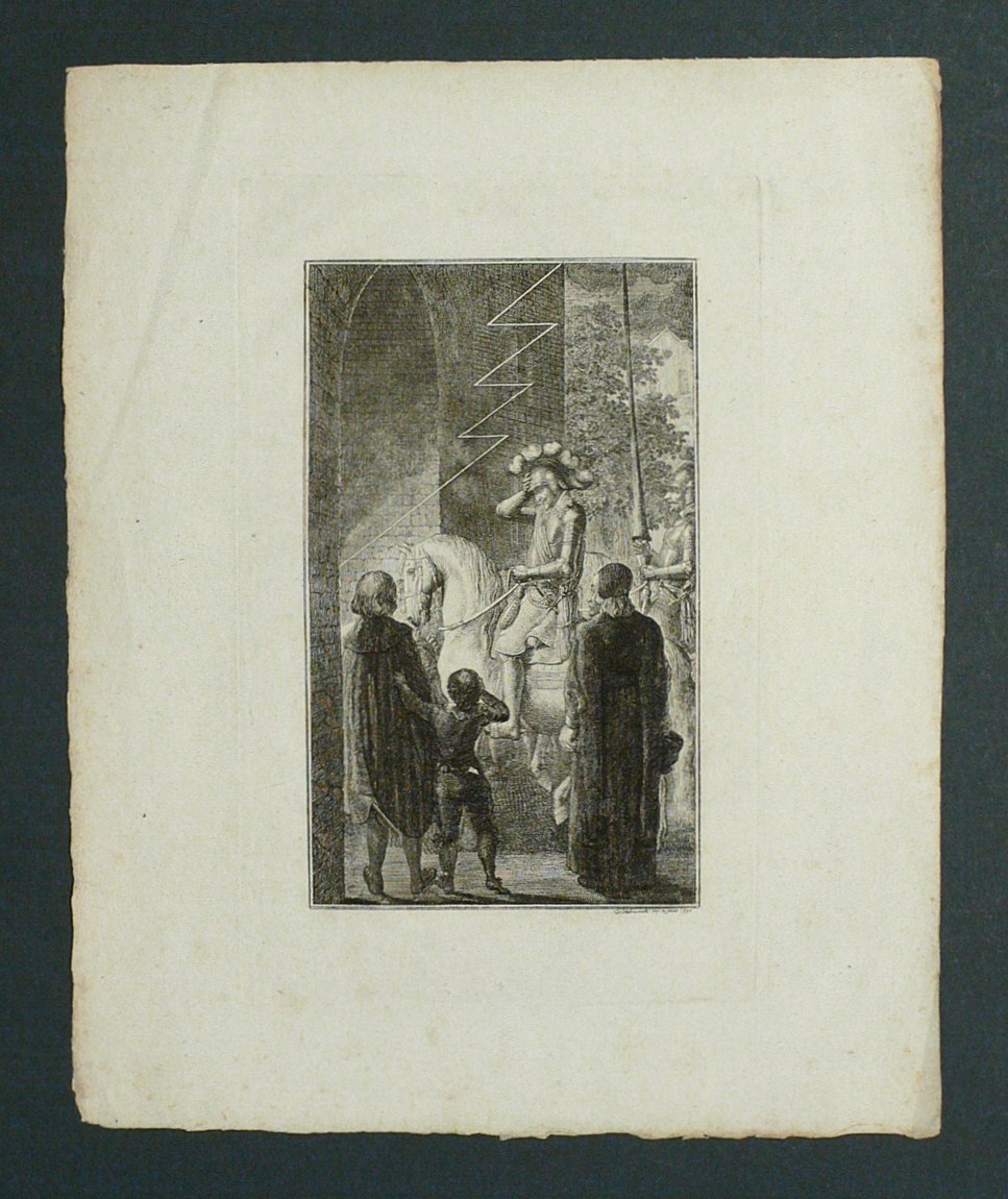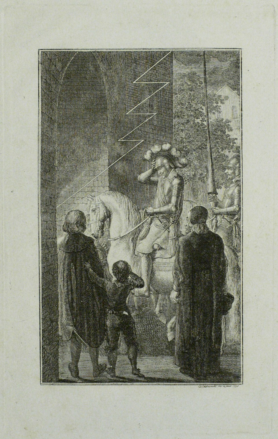 Bauer 1839. Engelmann 837. – Aus: Deutsche Monatsschrift (Leipzig: Sommer 1790-1799). – In der Platte rechts unten signiert: ″D: Chodowiecki del: & fecit 1796″. – Blatt Nr. 6 aus der Folge der 18 Blätter zur Deutschen Monatsschrift. - Der schwedische König hält den einschlagenden Blitz beim Ritt durch ein Tor für ein göttliches Zeichen und vergibt der Stadt Landshut, die er brandschatzen lassen wollte. – Durchgehend etwas knickspurig, gewellt und geringfügig angeschmutzt. Links oben schwach ausgeprägte Diagonalfalte außerhalb der Darstellung. Insgesamt mäßig guter Zustand.