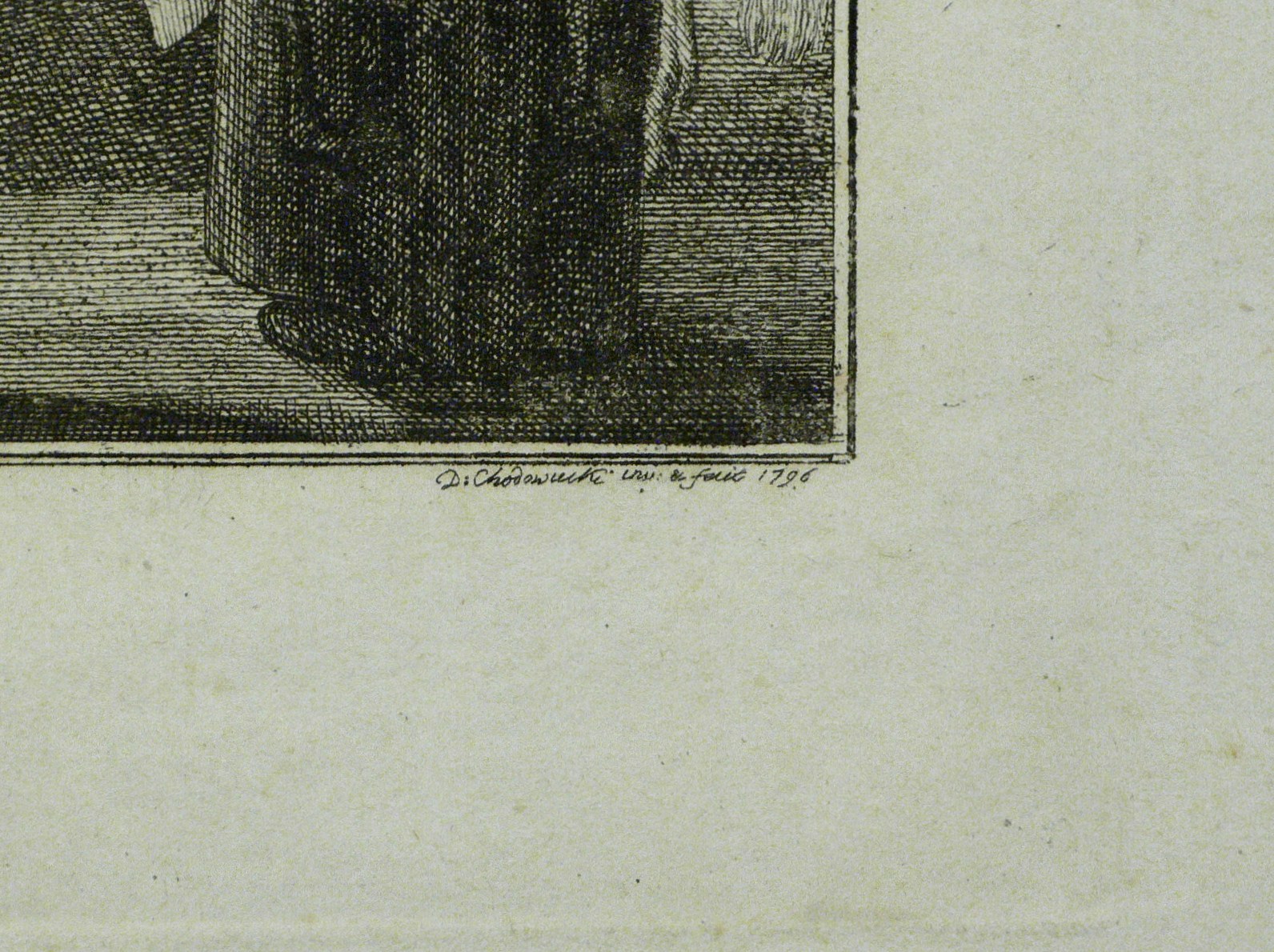 1796. Radierung / Strichätzung. – Originale Künstlergrafik, von Daniel Nikolaus Chodowiecki. – 16,2 x 9,8 cm (Darstellung), 20,7 x 12,9 cm (Platte), 27 x 22 cm (Blatt).