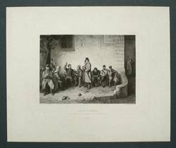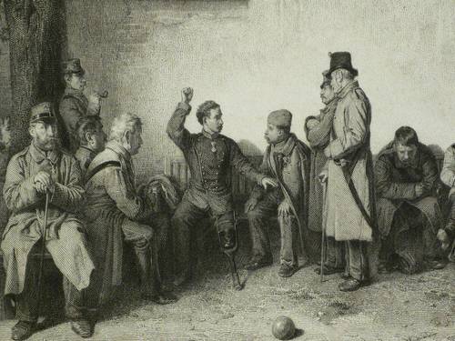 Rechts unten in der Platte signiert: ″Gest. v. Eugen Doby.″ Mittig der Titel mit der Druckeradresse ″F. Kargl, Wien″ und dem Trockenstempel ″Der Hamburger und der ältere Wiener Kunstverein″. – Nach dem gleichnamigen Gemälde von Friedrich Friedländer aus dem Jahre 1869, welches sich in der Sammlung der Wiener Akademie der bildenden Künste befindet. Das Gemälde zeigt ein Wiener Invalidenheim mit Kriegspensionären aus dem sogenannten Deutsche Krieg zwischen Österreich und Preußen von 1866, von denen ein Neuankömmling offenbar packend von seinen Schlachterlebnissen berichtet. – Blatt offenbar originalrandig, von schöner unberührter Erhaltung. Unscheinbare Stockflecken im großzügig breiten Rand.