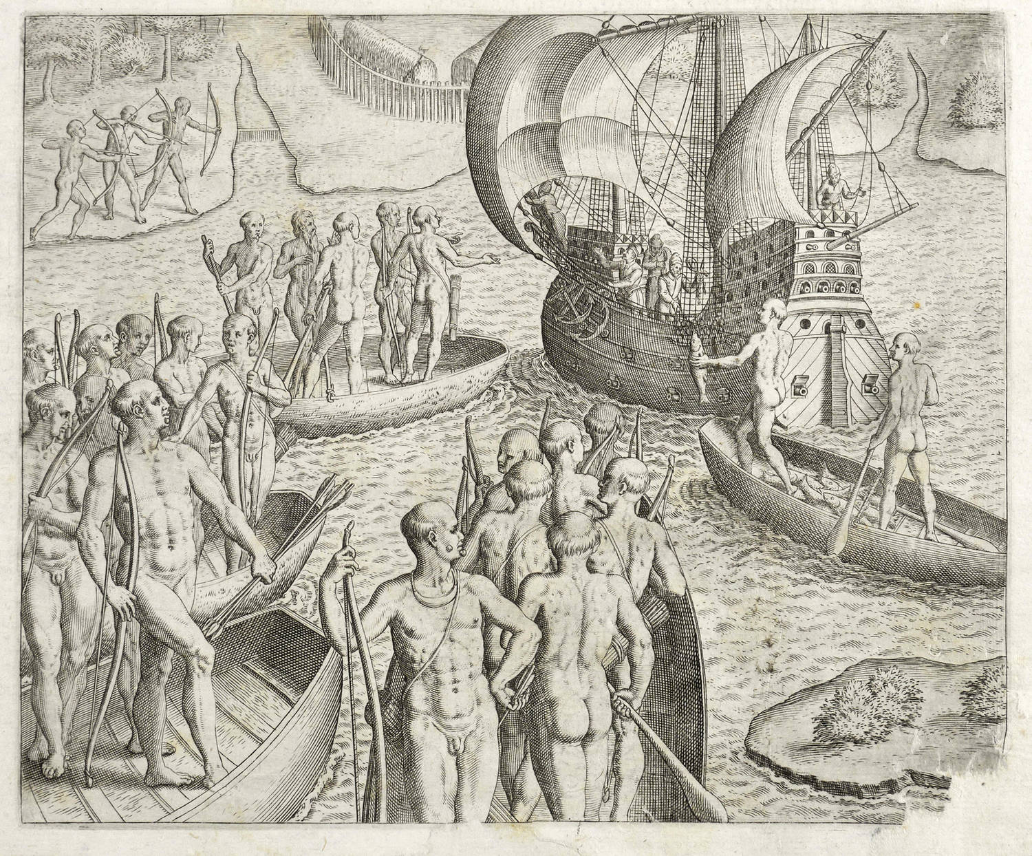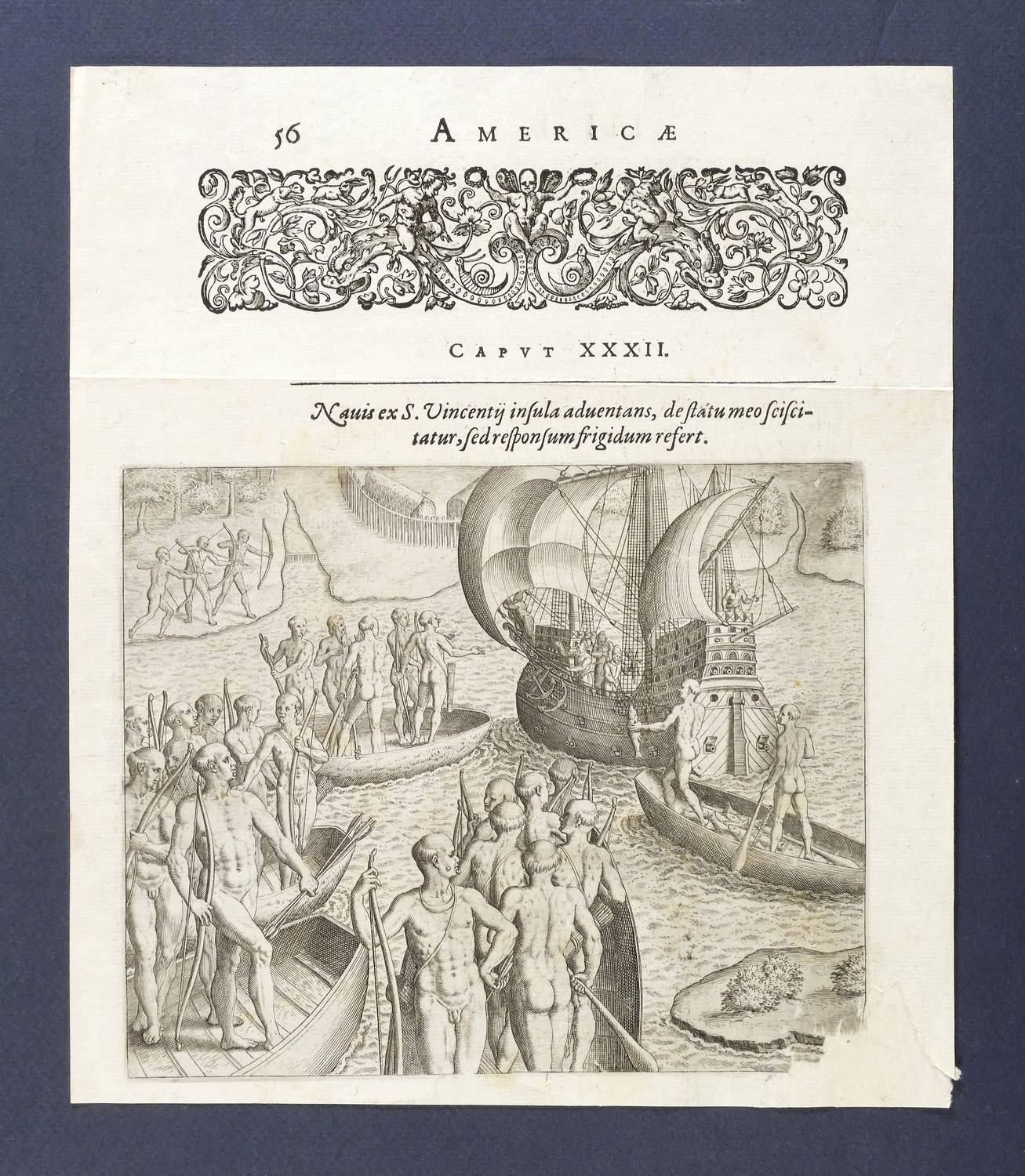 Aus: Hans Staden, Americae tertia pars. Memorabile provinciae Brasiliae Historiam, contines, germanico primum sermone (Frankfurt am Main: Theodor de Bry 1592). – Oben typografischer Kopftitel: ″AMERICAE / III. Pars.″. Oberhalb lateinischer Titel: ″Nauis ex S. Vincentij insula aduentans, de statu meo sciscitatur, sed responsum frigidum refert″. – Darstellung eines spanischen Expeditionsschiffes vor der Küster der Insel Saint Vincent, umgeben von mehreren Boote der Einheimischen Insel-Kariben oder Kalinago. Eines der Boote gefüllt mit gefangenem Fisch. In den anderen stehend mit Pfeil und Bogen bewaffnete Krieger. - Sehr schöne Ausstattung mit Buchschmuck, Kopf- und Schluss-Vignetten etc. – Ecke rechts unten mit leichtem Papierverlust restauriert. Insgesamt guter Zustand.