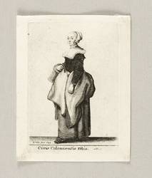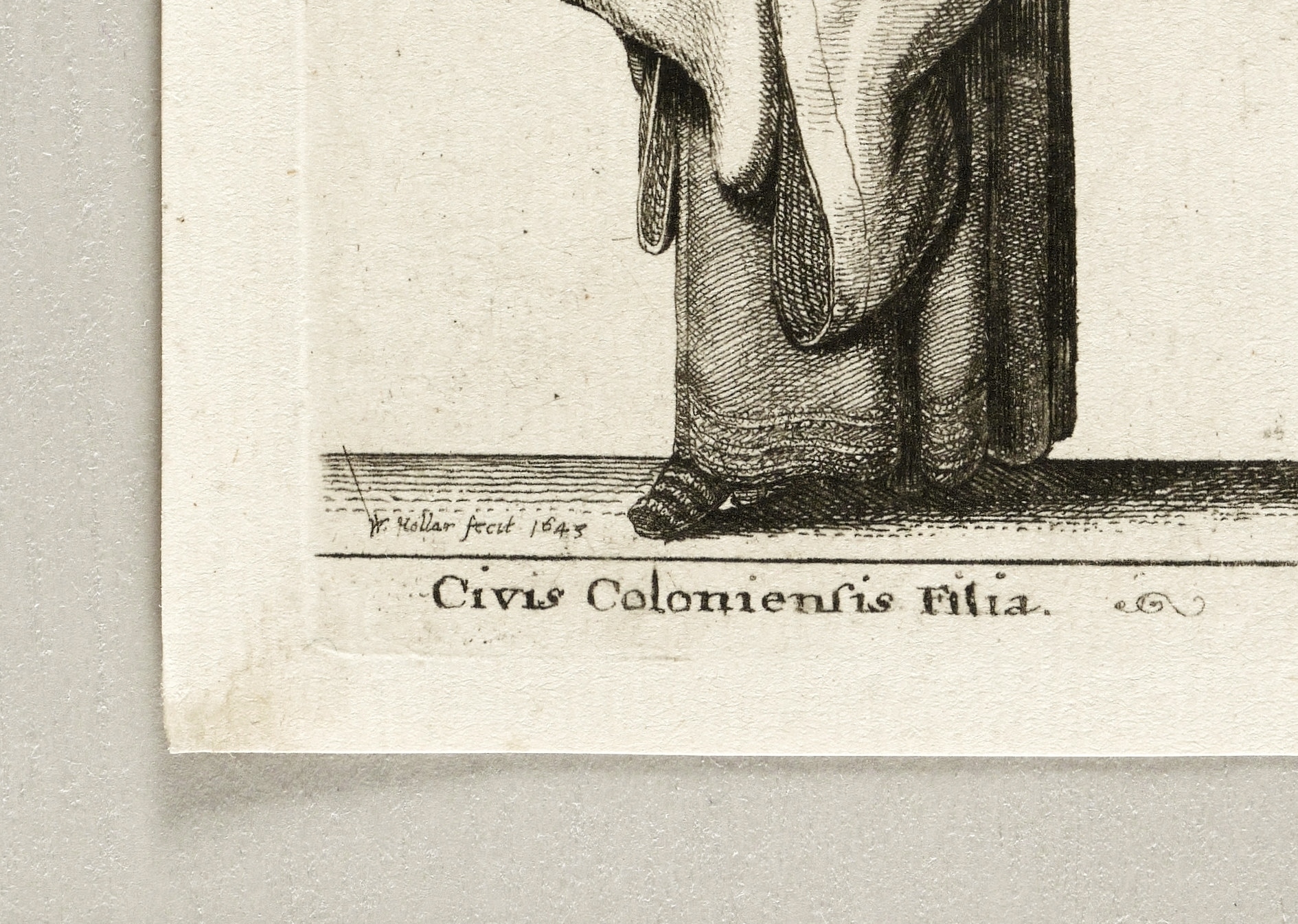 Parthey 1839. (32.). – Aus: Wenzel Hollar, Theatru[m] mvliervm, sive, Varietas atq[ue] differentia habituum foeminei sexus diuersorum Europae nationum hodierno tempore (London: 1643). – Links unten signiert und datiert: ″W. Hollar fecit 1643″. Unterhalb der Darstellung betitelt. – Blatt verso mit geringen Montageresten. Sonst guter Zustand.