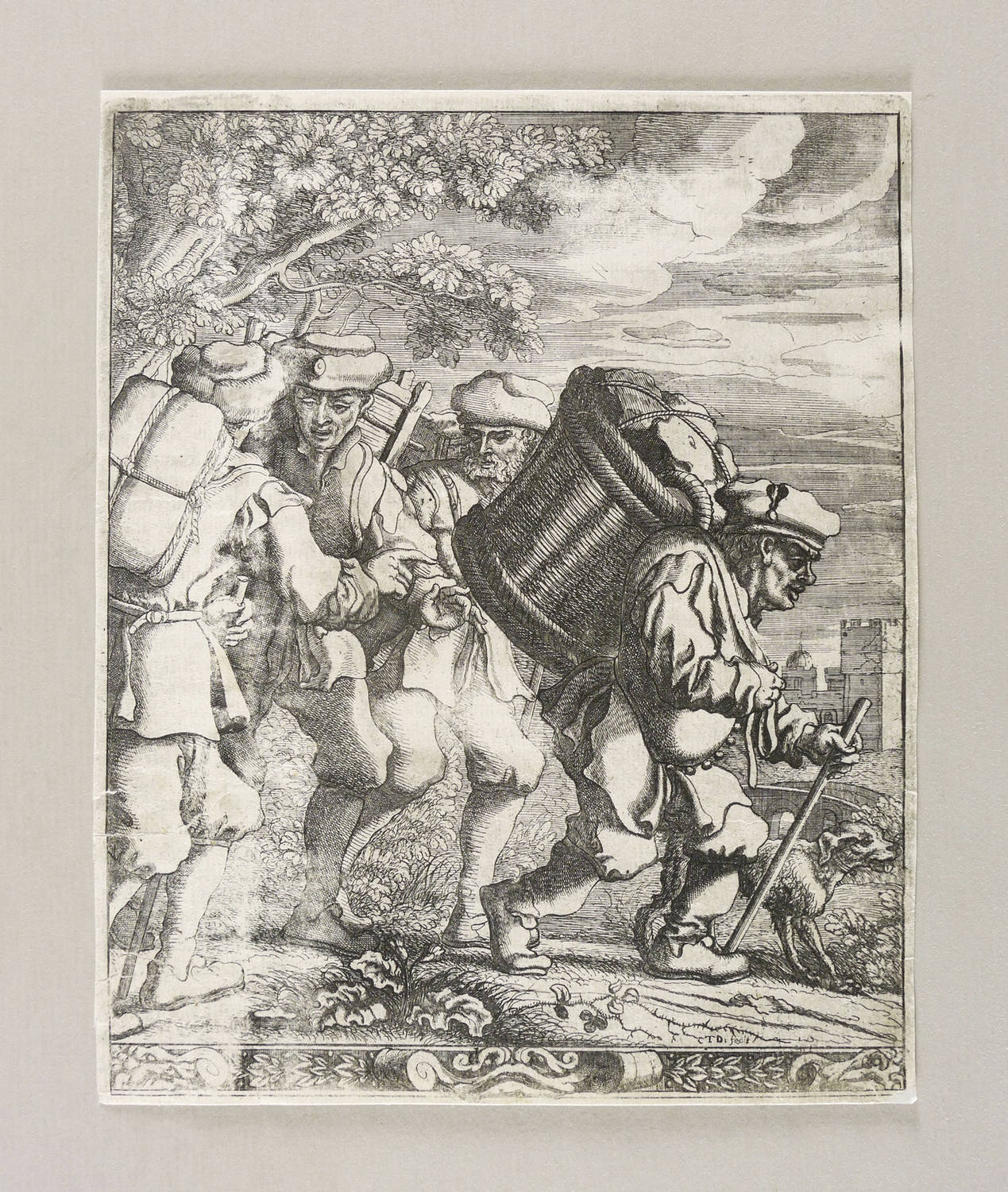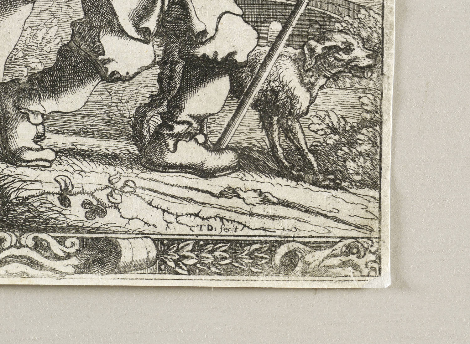 Aus: Aesop, Les fables d'Esope. & de plusieurs autres excellens mythologistes (Amsterdam: Etienne Roger 1714). – Unten rechts innerhalb der Darstellung monogrammiert: ″TD: fecit″. – Französischer Rückentext. – Blatt bis auf den Plattenrand beschnitten. Teils etwas flau im Abdruck. Sonst aber guter Zustand.