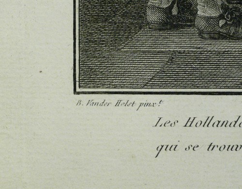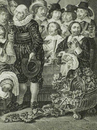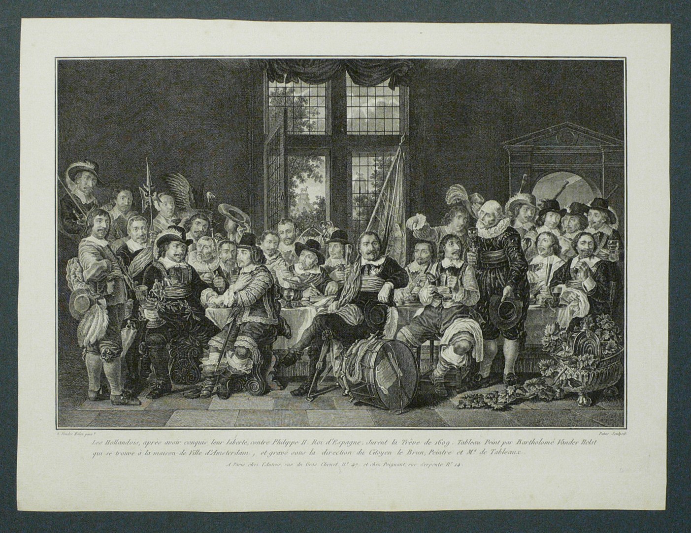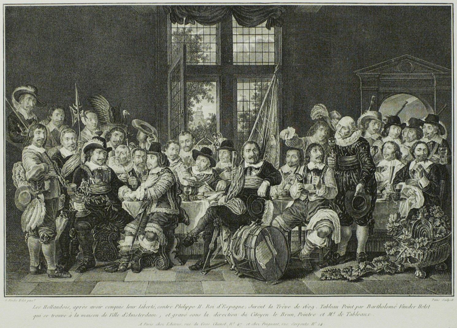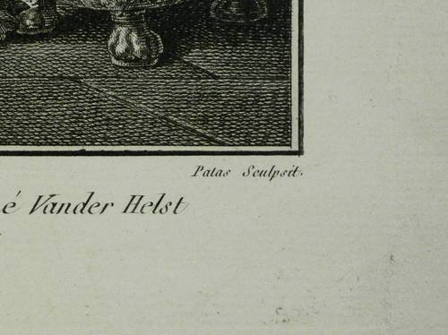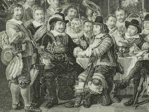 In der Platte rechts signiert: ″Patas Sculpsit.″ Unterhalb betitelt. – Wiedergabe des monumentalen Historienbildes ″Schützenmahl der Amsterdamer Bürgergarde zur Feier des Westfälischen Friedens 1648″ von Van der Helst im Rijksmuseum Amsterdam. – Umlaufend schmaler Rand um die Platte, das Büttenpapier von frischer Wirkung, kontrastreicher Abzug. Insgesamt sehr guter Zustand.