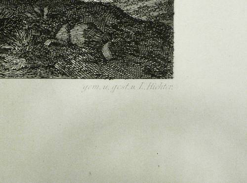 Hoff-Budde 206 [1875, 3]. Hoff 170. – Aus: Adrian Ludwig Richter, Landschaften von Ludwig Richter. Zwölf Original-Radirungen (Leipzig: Alphons Dürr 1875). – In der Platte rechts unten signiert ″gem. u. gest. v. L. Richter.″ Mittig Druckeradresse Friedrich Felsing, München. Unterhalb gestochener Titel. – Später originaler Abzug der schon 1831 für die ″Bilderchronik″ des Sächsischen Kunstvereins hergestellten Platte. – Originalrandiges Blatt ohne erkennbare Lager- und Altersspuren. Hervorragendes Exemplar.