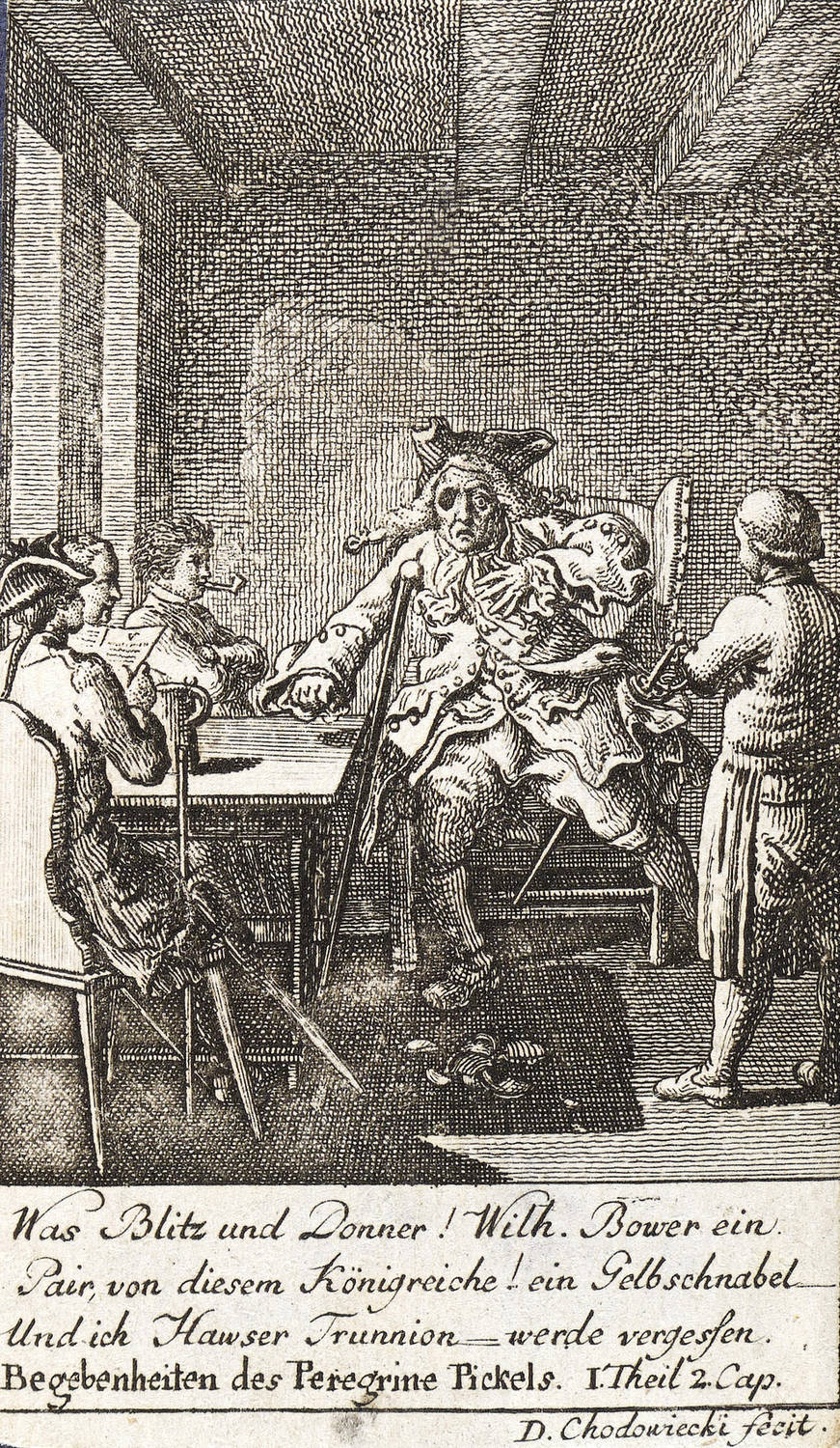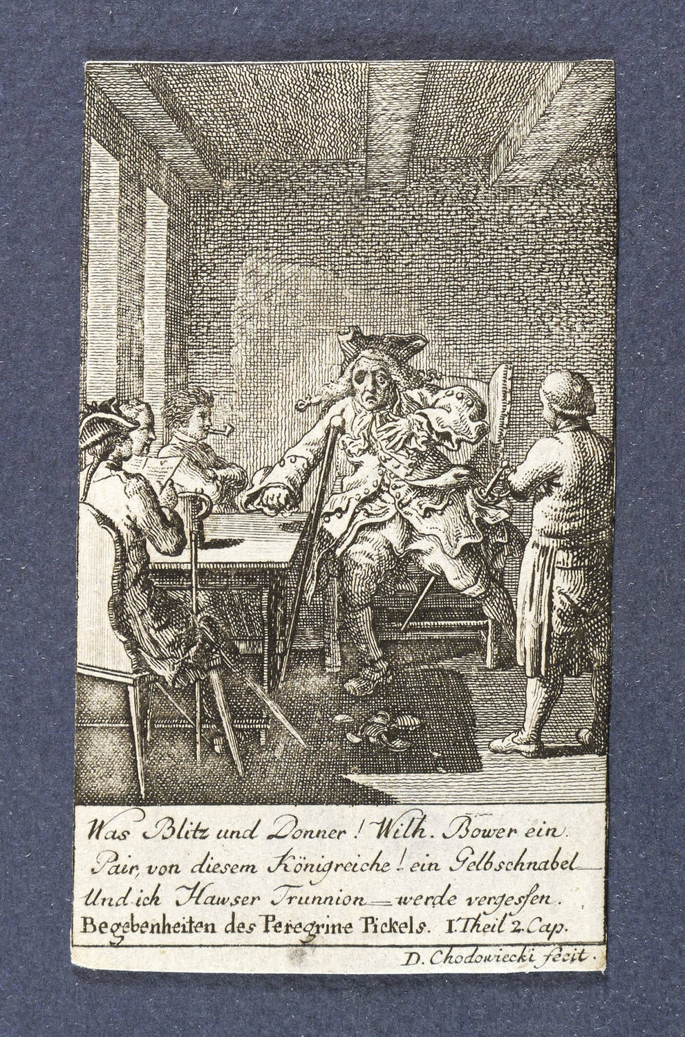 Bauer 1147. Engelmann 533-1. – Aus: [Historisch-genealogischer Kalender]. Berliner Genealogischer Calender auf das Jahr 1786 (Berlin: Königliche Preußische Kalender-Deputation 1786). – In der Platte rechts unten gestochene Signatur: ″D. Chodowiecki fecit.″ Inschrift: ″Was Blitz und Donner! Wilh. Bower ein Pair von diesem Königreiche″ ein gelbschnabel ... Und ich Hawser Trunnion ... werde vergessen.″ Dazu bezeichnet: ″Begebenheiten des Peregrine Pickels. I. Theil 2 Cap.″ – Erstes Blatt von 12 Blättern zu ″Peregrine Pickle″. - Der kriegsinvalide Kommodore Trunnion erregt sich im Wirthaus über die Erhebung des Konkurrenten Admiral Bower so sehr, dass er seinen Bierkrug fallen lässt. – Auf Einfassungslinie und Schrift beschnitten. Mäßig guter Zustand.