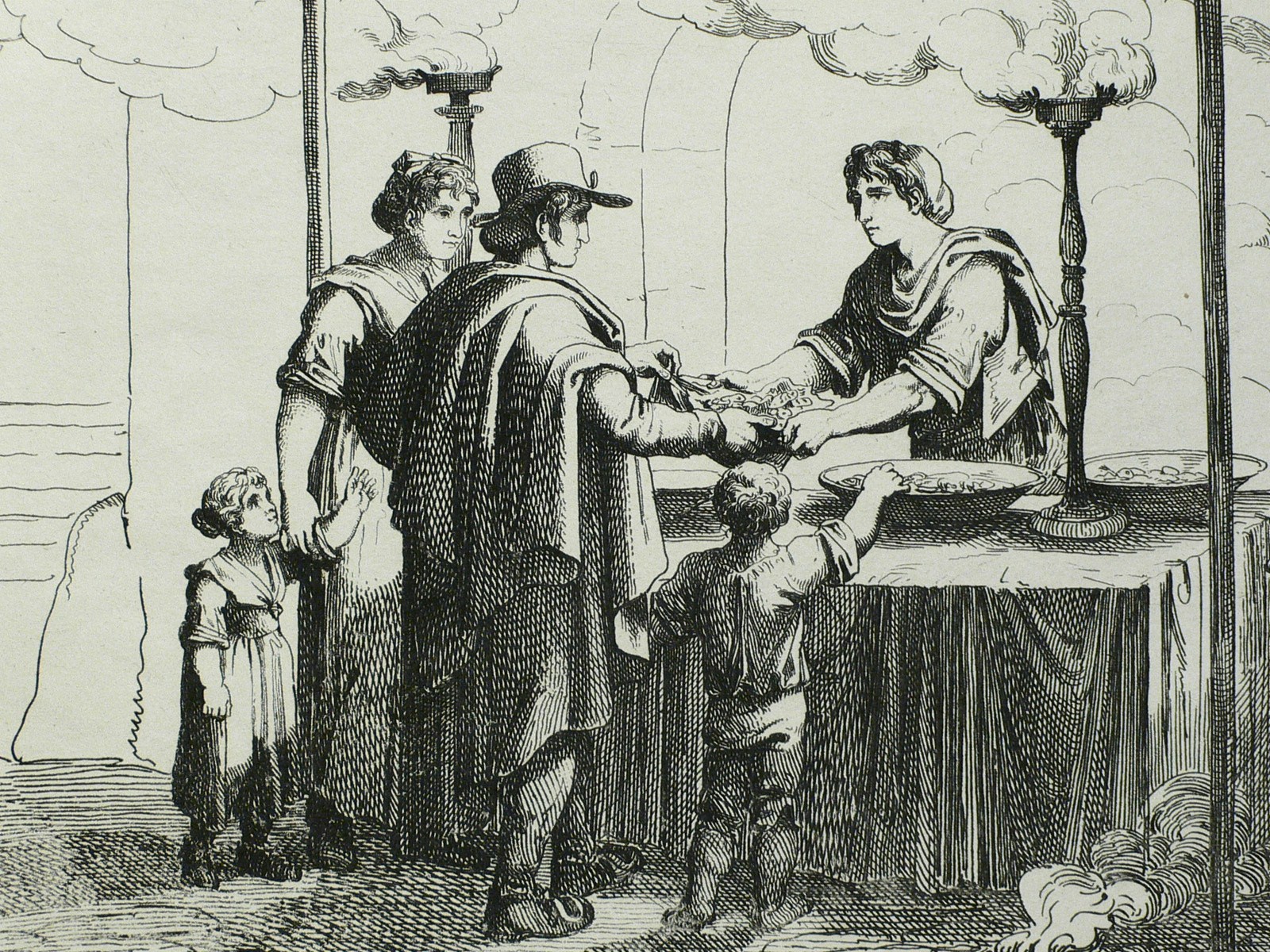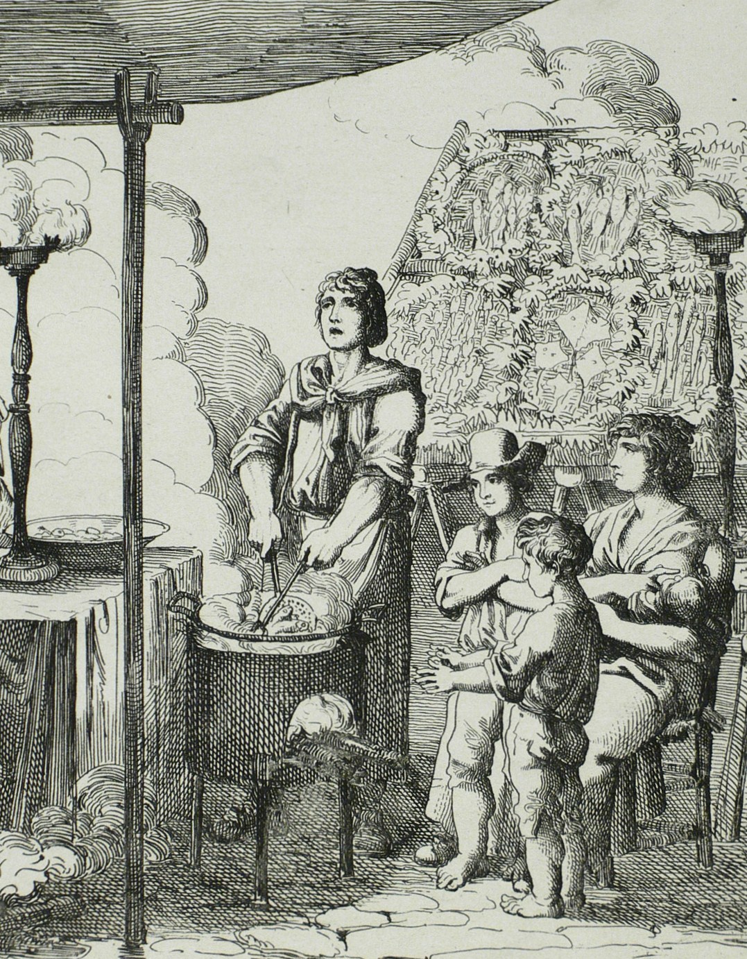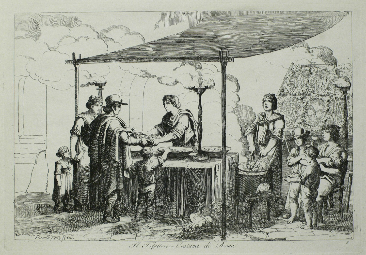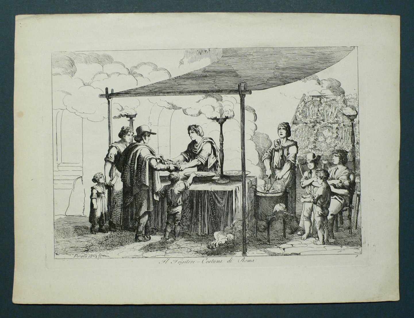 Aus: Bartolomeo Pinelli, Raccolta di cinquanta costumi pittoreschi incisi all acqua forte (Rom: Lazzari 1809). – In Platte innerhalb der Darstellung links unten signiert: ″Pinelli 1809 Roma″. Unterhalb der Darstellung betitelt und rechts nummeriert. – Verkaufsstand mit Körben voll frischem Fisch, einer den Fisch in einer Pfanne zubereitenden Frau, diversen Familienangehörigen, einem Verkäufer sowie einigen Rauchfässern, die wohl zur Vertreibung lästiger Fliegen eingesetzt wurden. – Im Rand etwas knickspurig und partiell auch fleckig. Mäßig guter Zustand.