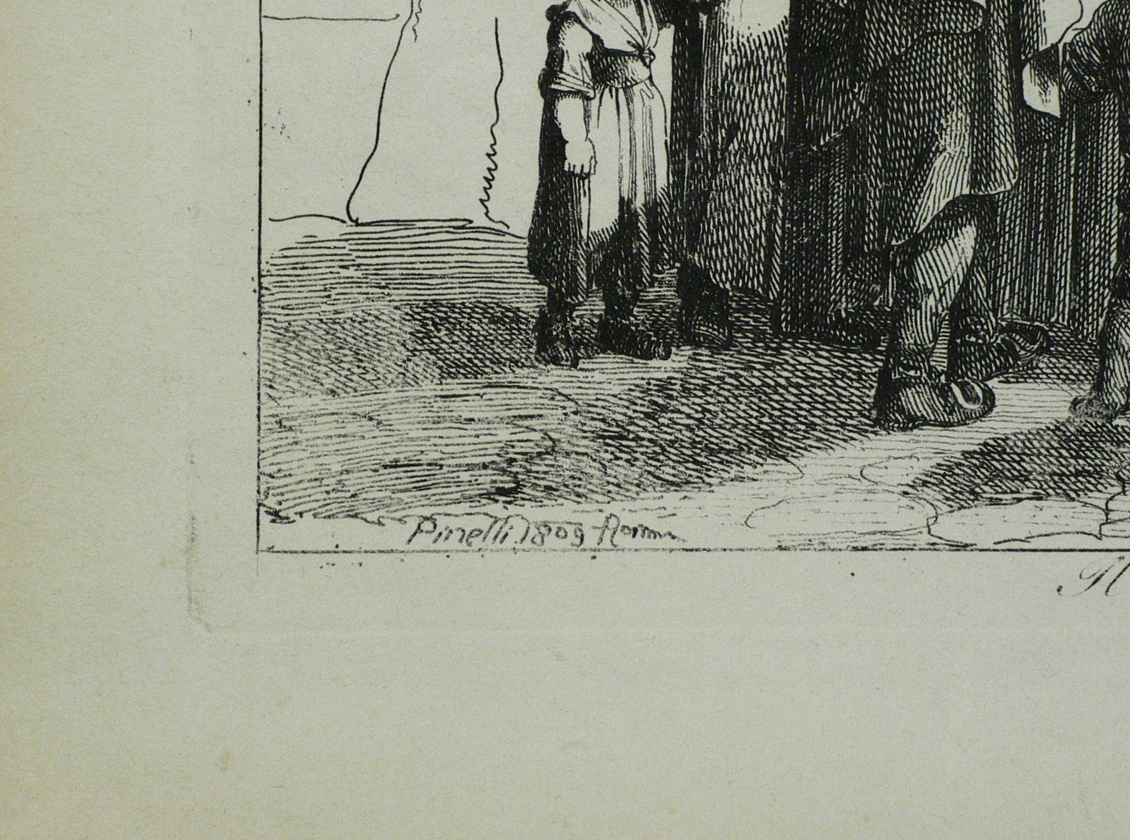 Bartolomeo Pinelli (1781 Rom - 1835 Rom). Italienischer Kupferstecher und Radierer. Vertreter des italienischen Neoklassizismus. Studium an der Accademia di San Luca in Rom und an der Accademia di Belle Arti in Bologna. Bevorzugte Genre- und Alltagsszenen, oft bukolischer Natur. Veröffentlichte 1809 die Radierfolgen "La Raccolta di Cinquanta Costumi Pittoreschi" und "L’istoria Romana". Illustrierte Dantes Göttliche Komödie und Cervantes Don Quichote.