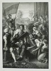 Raffael (1483 Urbino - 1520 Rom). Italienischer Maler und Architekt der Hochrenaissance. Um 1500 ging er nach Perugia in die Lehre von Pietro Vanucci, genannt Perugino. 1504-06 war Florenz wie auch Perugia tätig. Ab 1508 unter dem kunstsinnigen Papst Julius II. in Rom tätig. Nach Bramantes Tod im Jahre 1514 übernahm Raffael die Leitung des Baues der neuen Peterskirche.