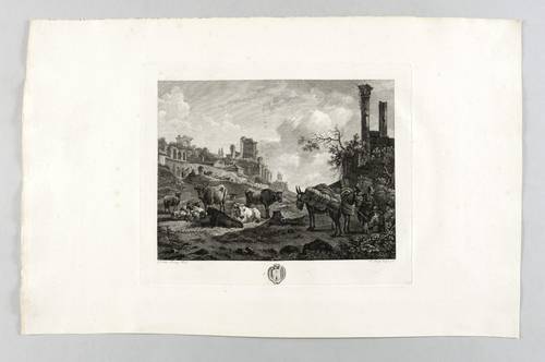 Daudet, Robert. – Nach Willem Romeyn. – „Südliche Landschaft mit Ruinen und Vieh”.