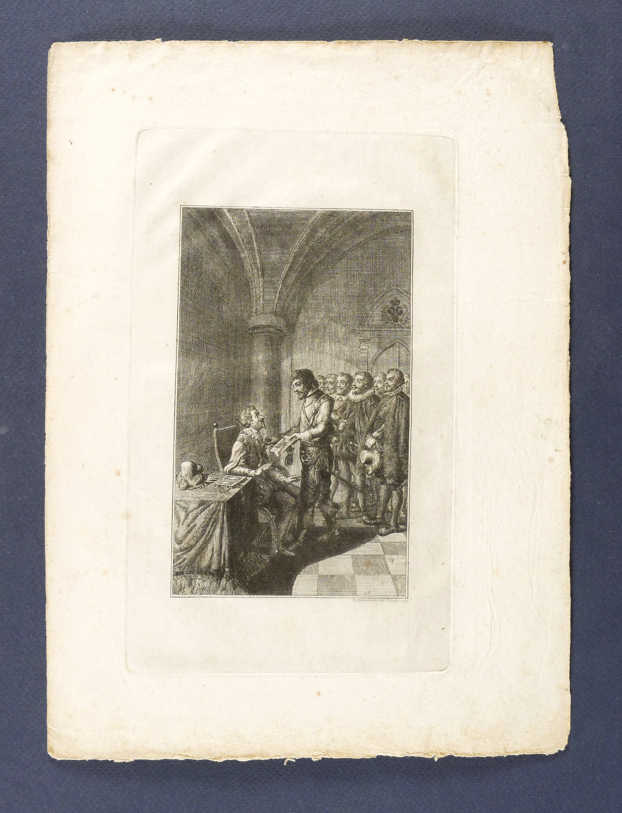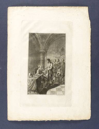 Bauer 1837. Engelmann 835. – Aus: Deutsche Monatsschrift (Leipzig: Sommer 1790-1799). – In der Platte rechts unten signiert: ″D: Chodowiecki del & sculps 1798″. – Blatt Nr. 4 aus der Folge der 18 Blätter zur Deutschen Monatsschrift. - Der Kaiser sitzt in einem Raum der Wiener Burg, auf dem Tisch neben ihm Barett, Handschuhe und Gebetbuch. Die protestantischen Landstände Österreichs fordern die Bewilligung ihres Beitritts zu den Konförderierten Böhmens. Andreas Thonradtel von Evergassing hält den Kaiser an der Knopfleiste gepackt und fordert, ein entsprechendes Schriftstück zu unterzeichnen. – Durchgehend etwas knickspurig, gewellt und fleckig. Mäßig guter Zustand.