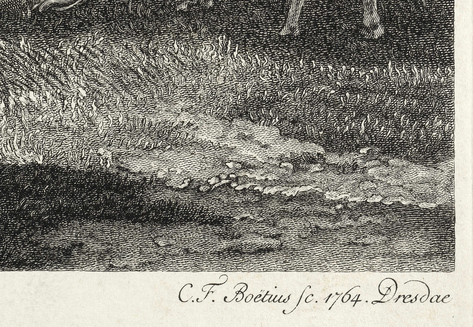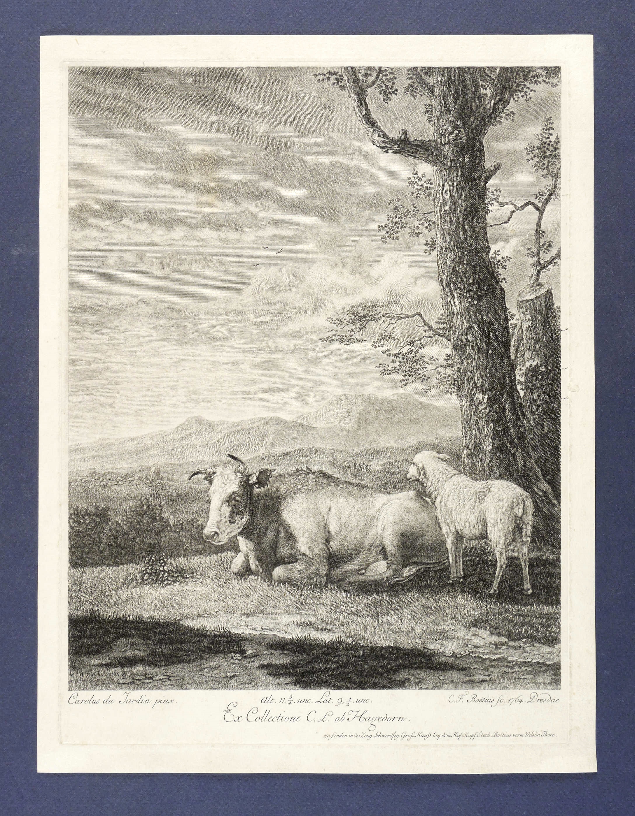 In der Platte rechts unterhalb der Darstellung signiert: ″C.F. Boetius sc. 1764. Dresdae″. Mittig bezeichnet: ″Ex Collectione C.L. ab Hagedorn.″ Mit der eigenen Verlagsadresse. – Schmaler Rand um die Platte. Kaum Mängel. Sehr guter Erhaltungszustand.