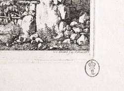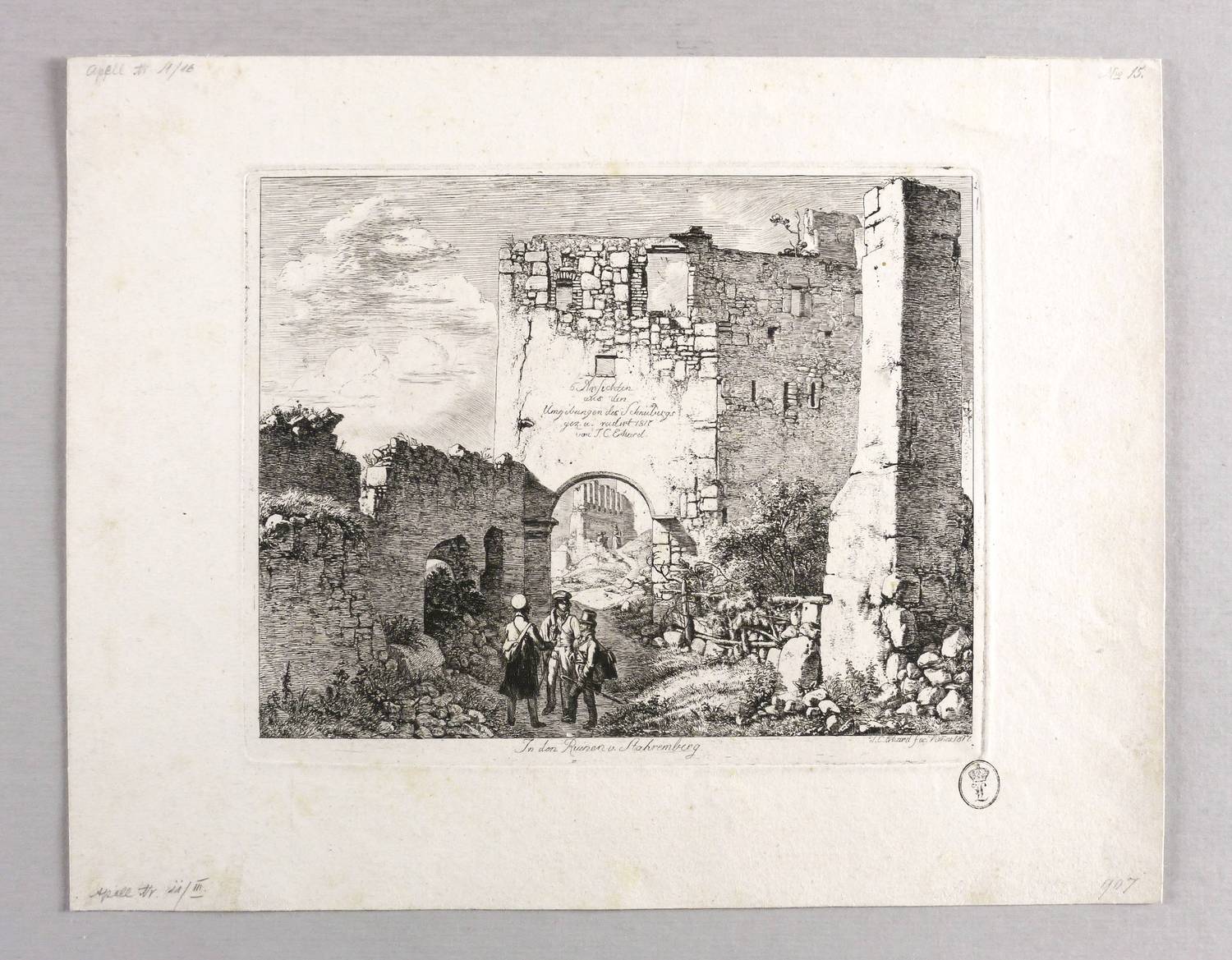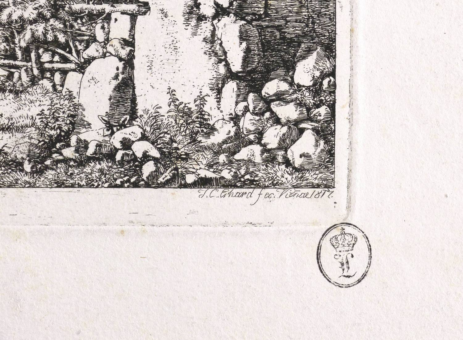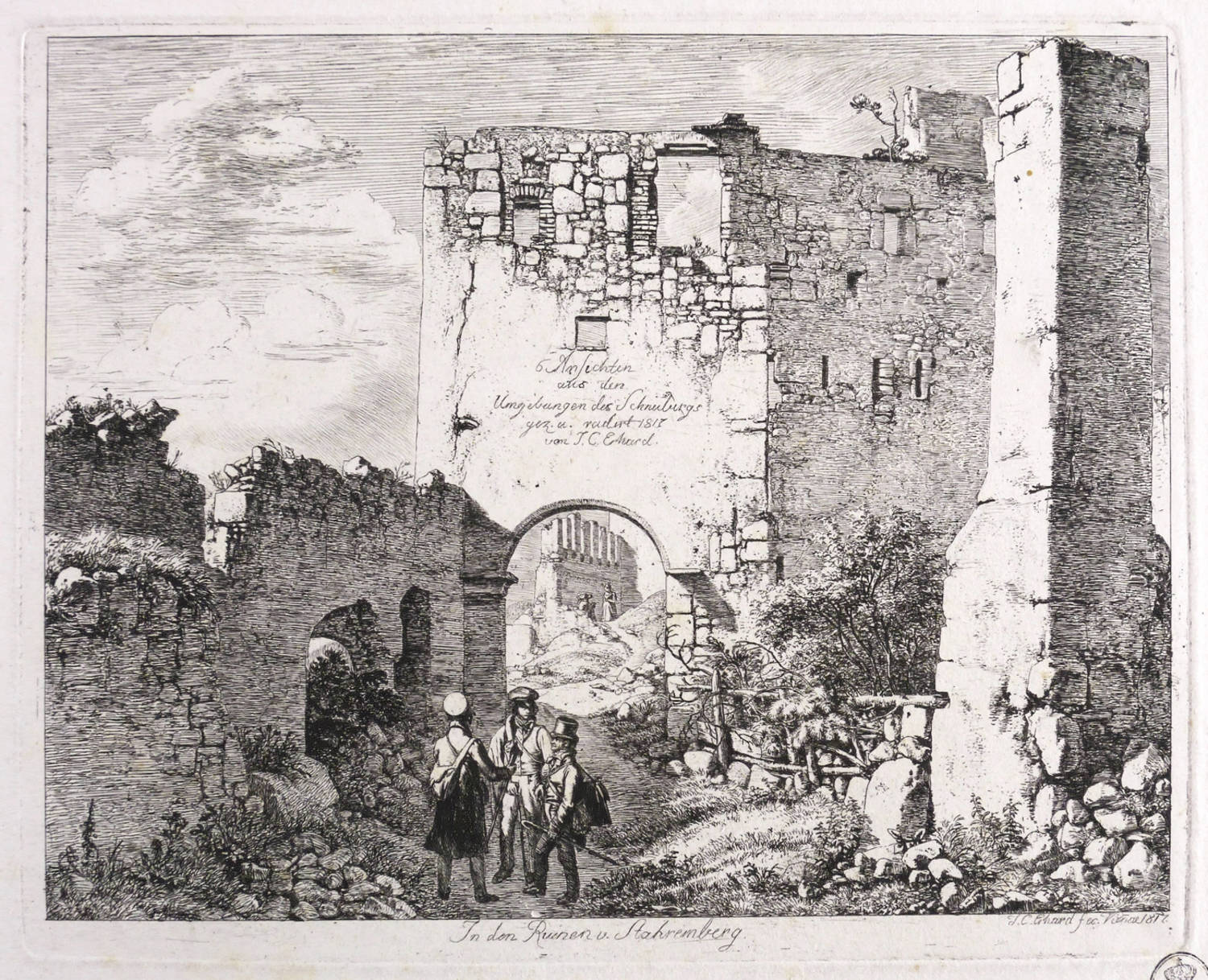 Apell 11 III (von III). – In der Platte rechts unten signiert und datiert: ″J. C. Erhard fec. Vien[n]ae 1817.″ Unterhalb der Darstellung betitelt. In der Darstellung über dem Torbogen bezeichnet: ″6 Ansichten aus den Umgebungen des Schneeberges gez. u. radirt 1817 von J. C. Erhard.″ Untern rechts Sammlerstempel. – Blatt mit dem Titel der Folge von sechs Blättern aus der Umgebung des Schneeberges bei Wiener Neustadt. Zu sehen sind neben dem Künstler die Freunde Heinrich Reinhold (links) und Ernst Welker (rechts). – Blatt teils schwach fleckig und verso mit Montageresten. Sonst aber guter Zustand.