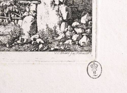1817. Radierung / Strichätzung, in Schwarz, auf Velin. – Originale Künstlergrafik, von Johann Christoph Erhard. – 17,0 x 21,1 cm (Darstellung / Platte), 24,5 x 31,5 cm (Blatt), 16,0 x 20,3 cm (Darstellung / Einfassungslinie).
