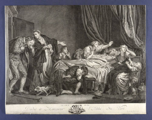 In der Platte rechts unten signiert: ″Grave par R. Gaillard.″ Links bezeichnet: ″Peint par J.B. Greuze.″ Mittig betitelt. Verlegeradresse des Künstlers, Paris. Widmung und Wappen. – Umlaufend knappes Rändchen um die Darstellung. Unten in der Schrift randrissig und etwas fleckig. Insgesamt mäßig guter Zustand.